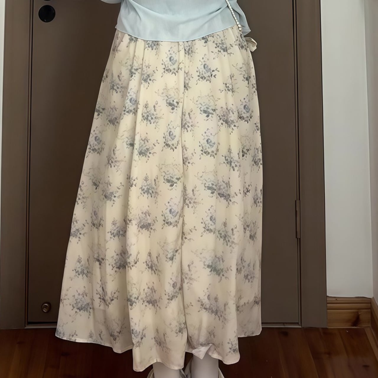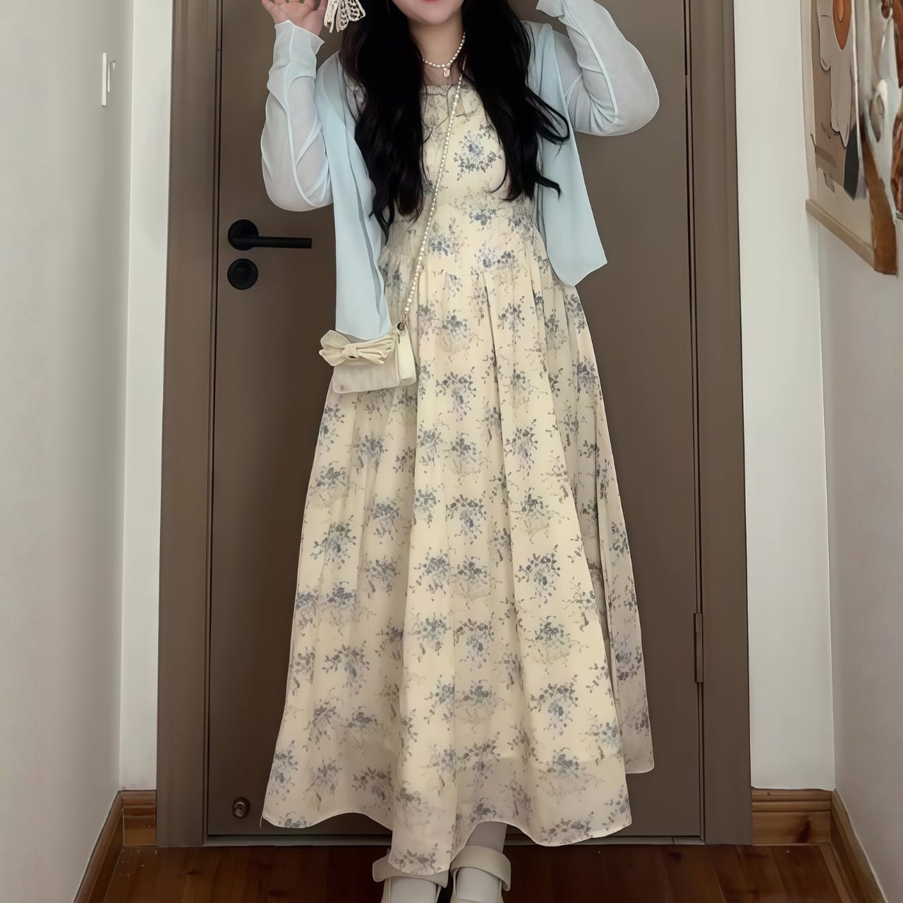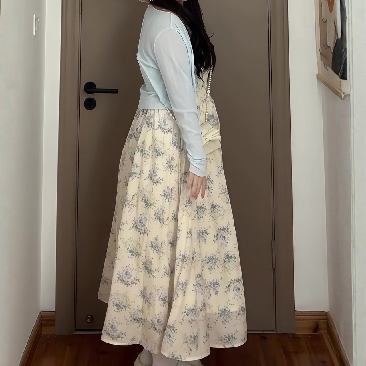 長袖 Aライン ミモレ丈 花柄 ワンピース&カーディガン f-0002