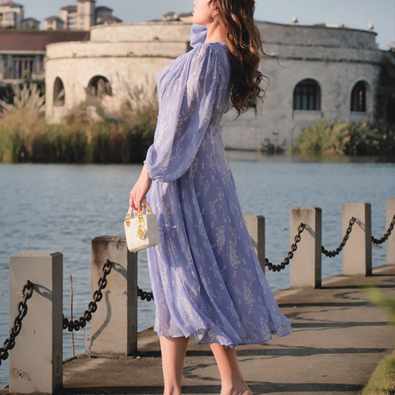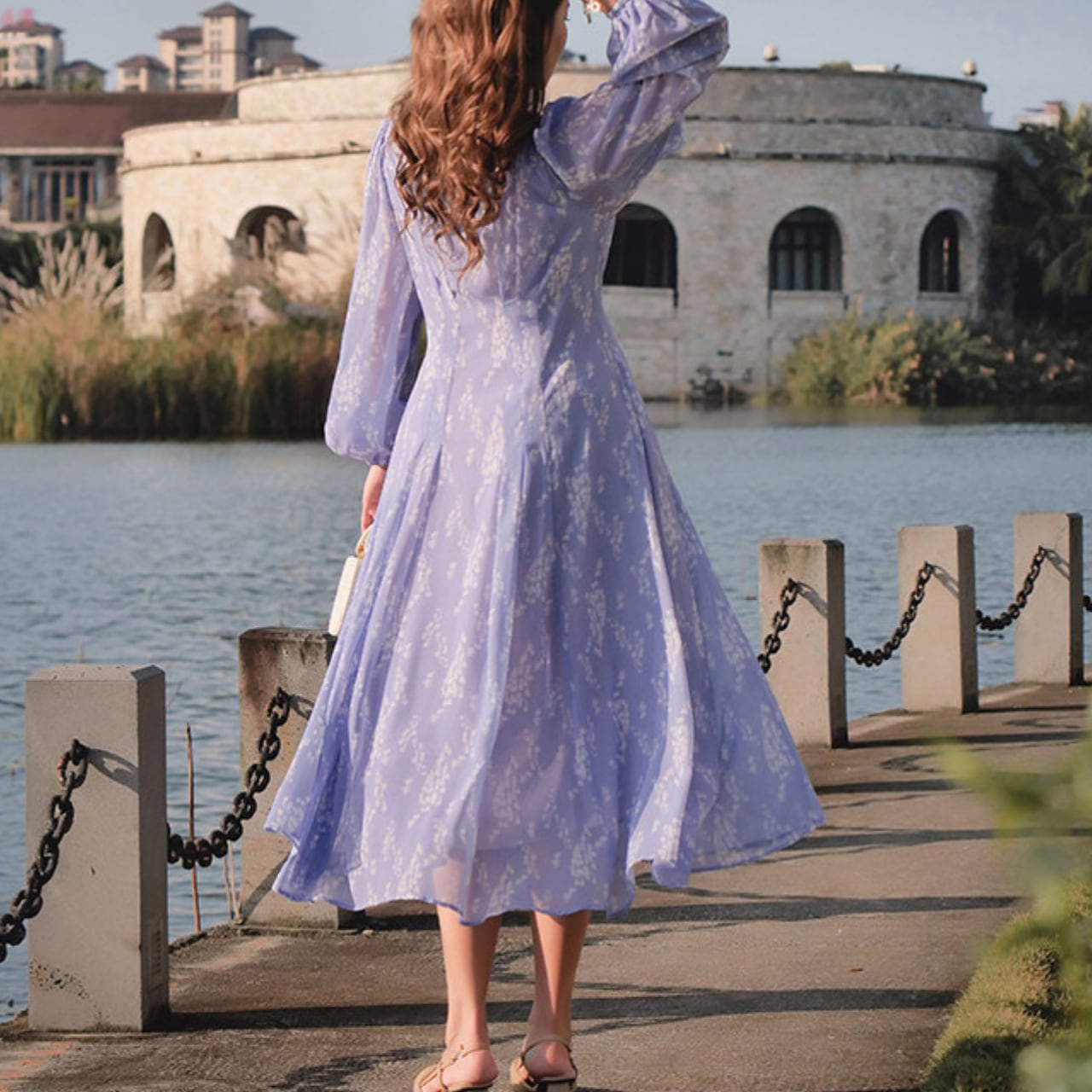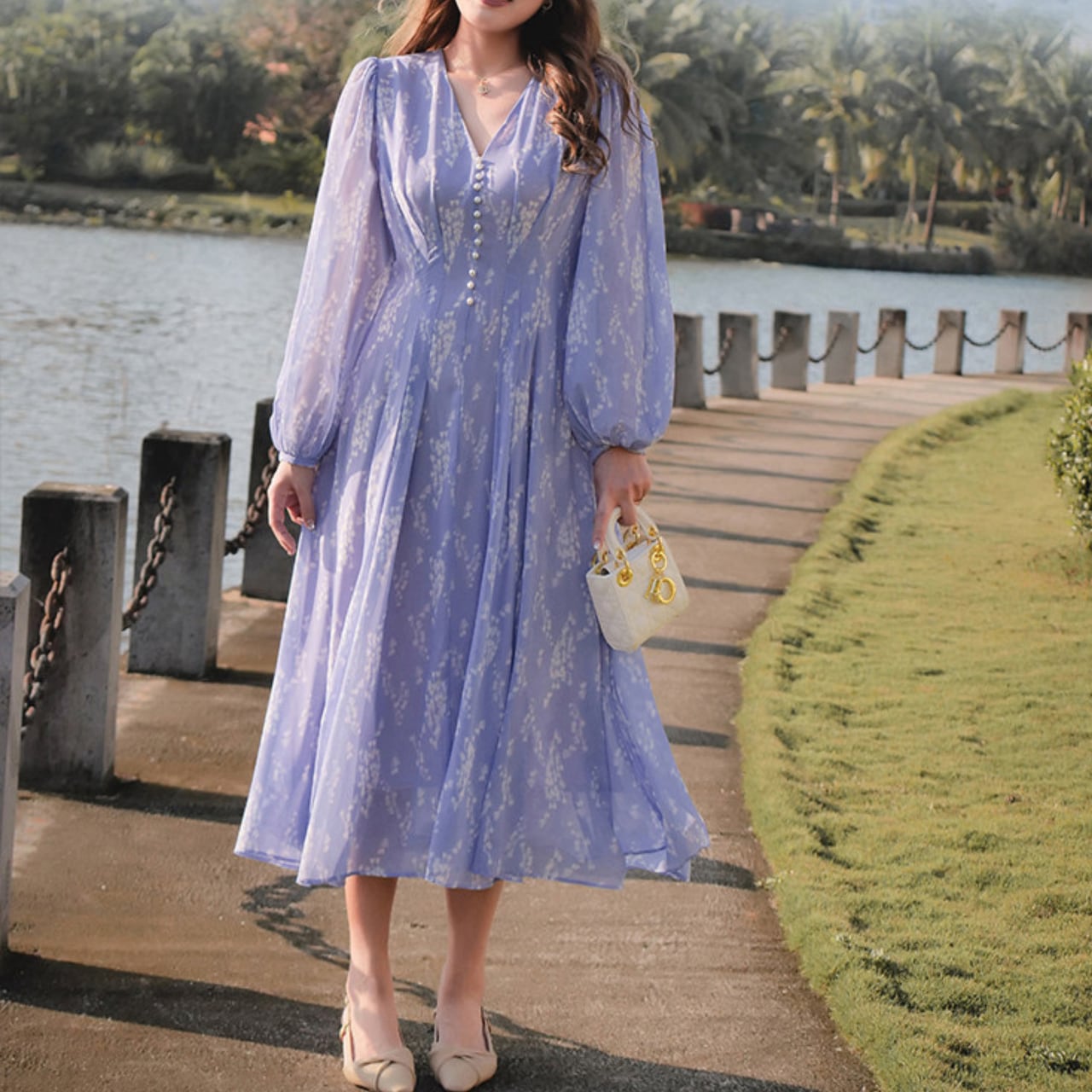 軽やかな印象で着こなせるミモレ丈ワンピース。