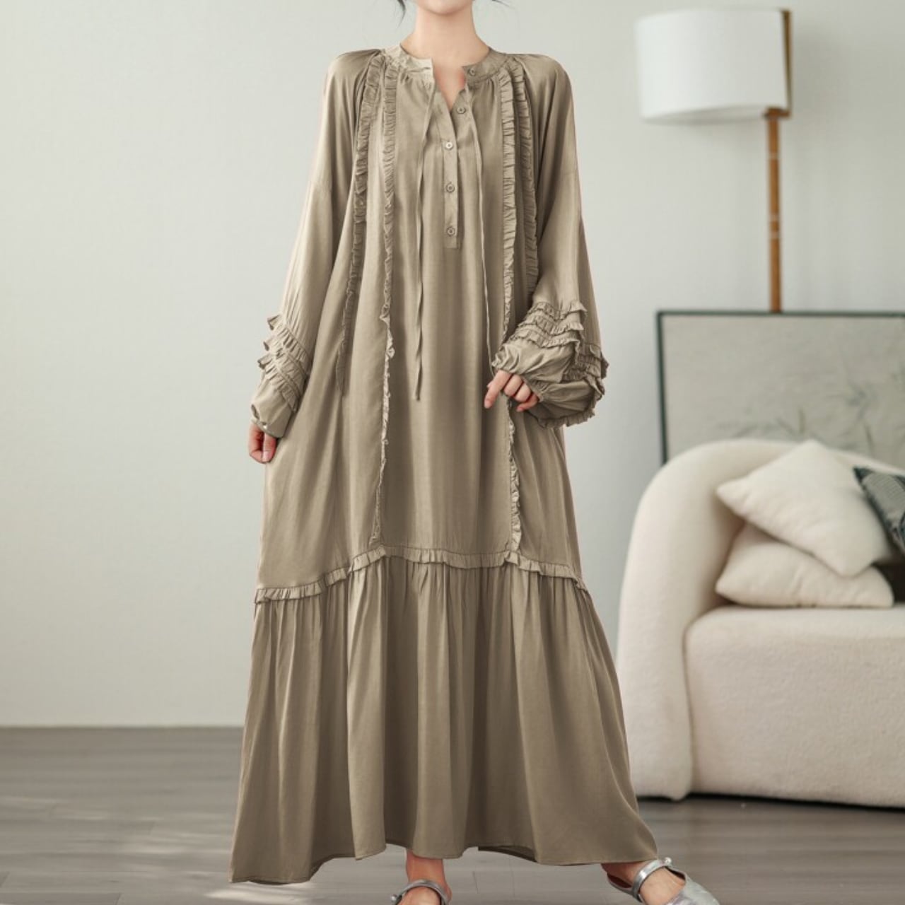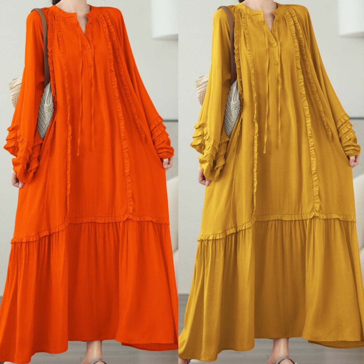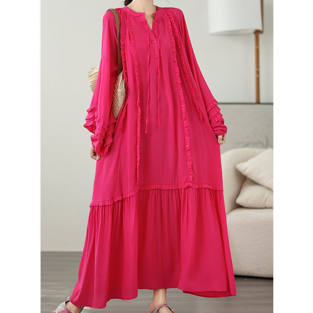 長袖 フリル ミモレ丈 ワンピース f-0007