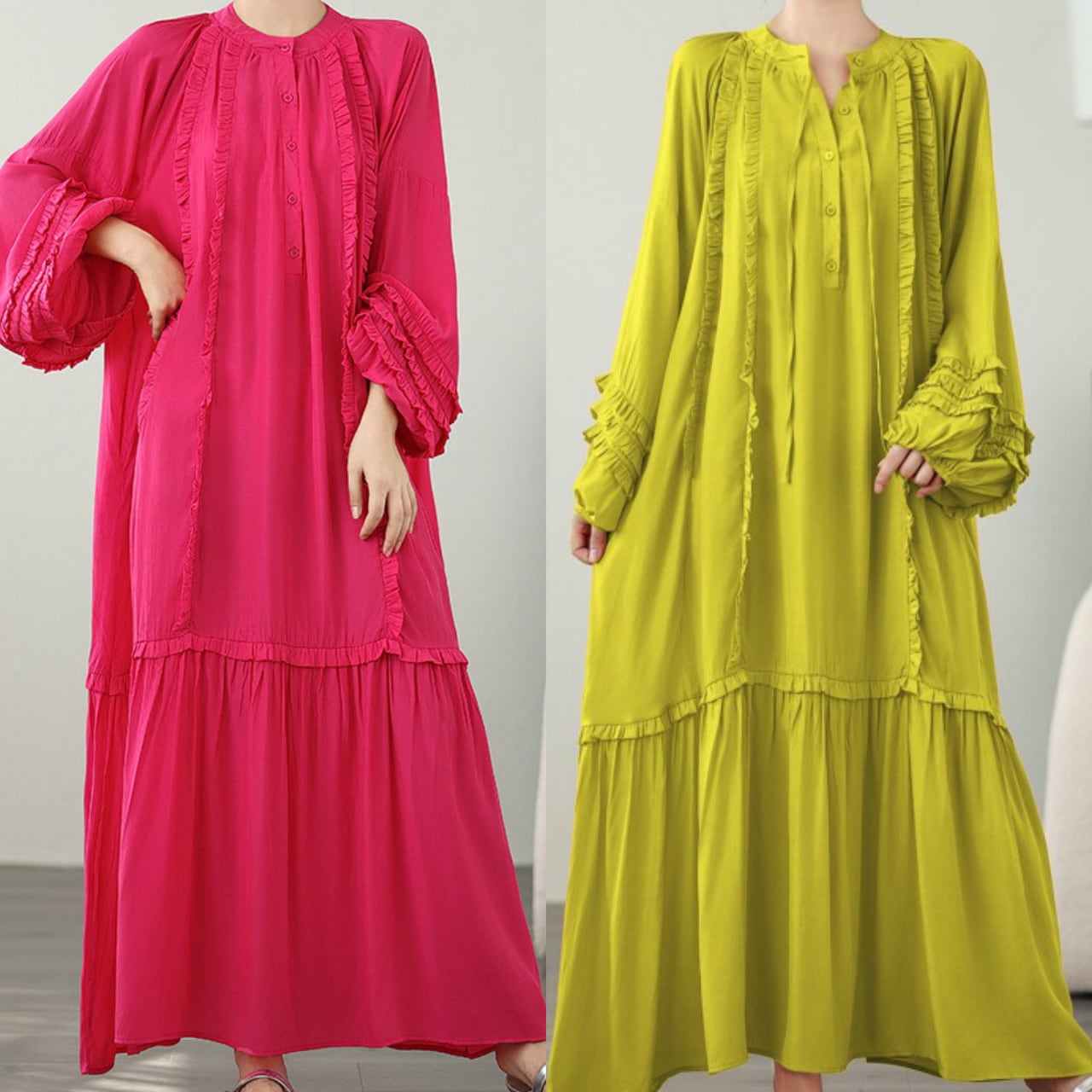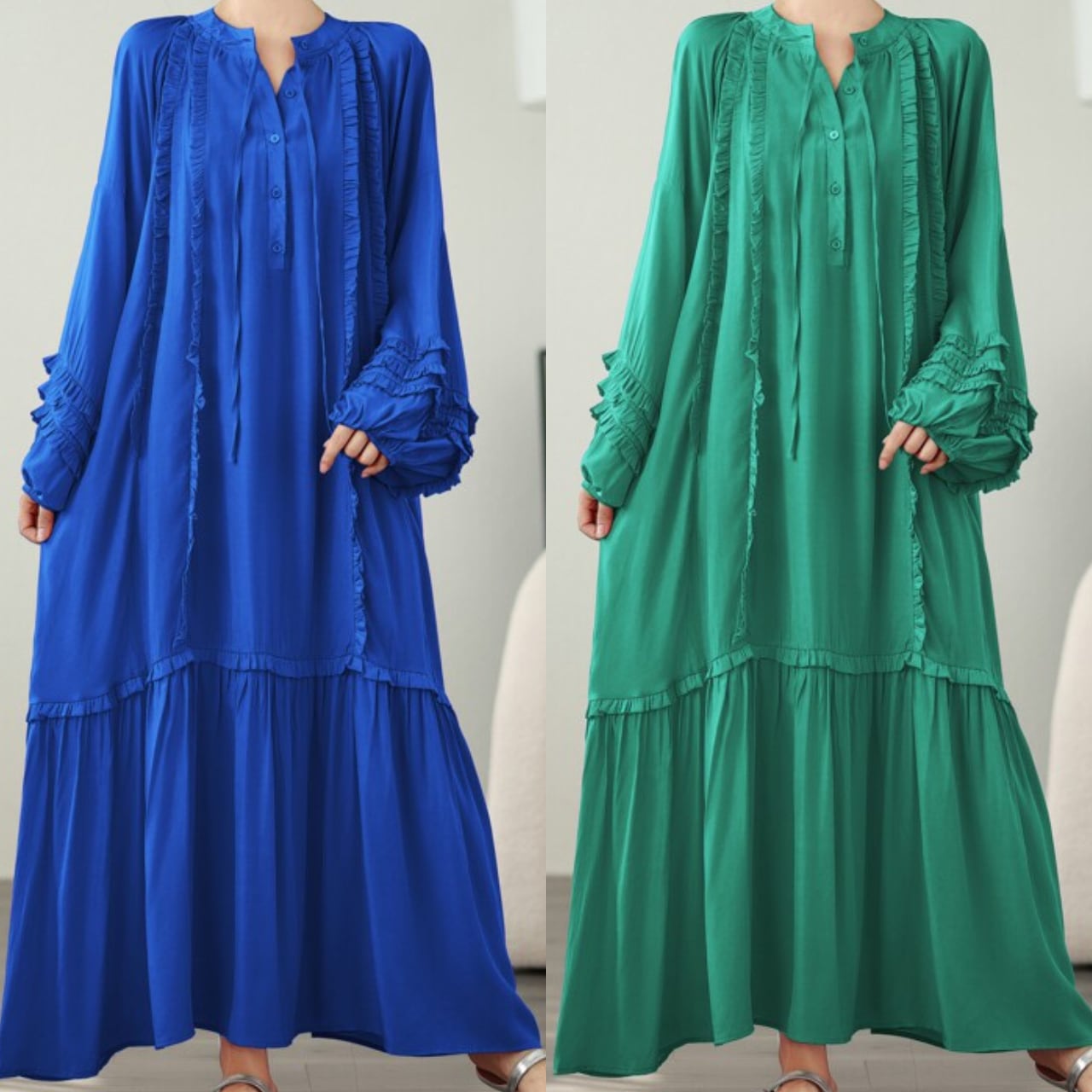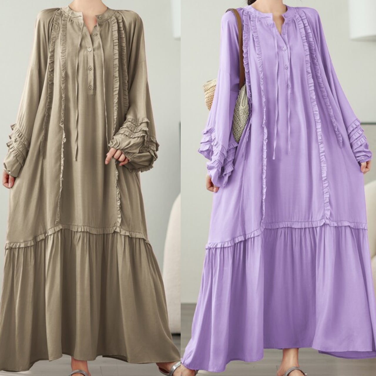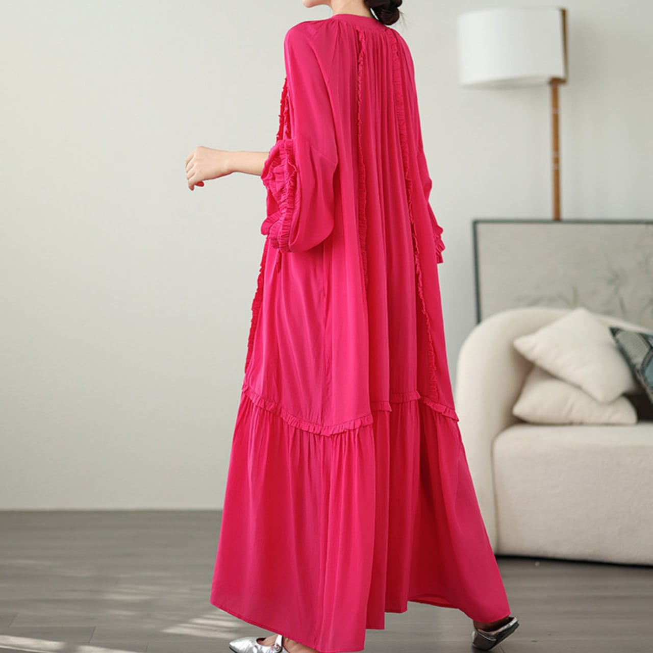 長袖 フリル ミモレ丈 ワンピース f-0007