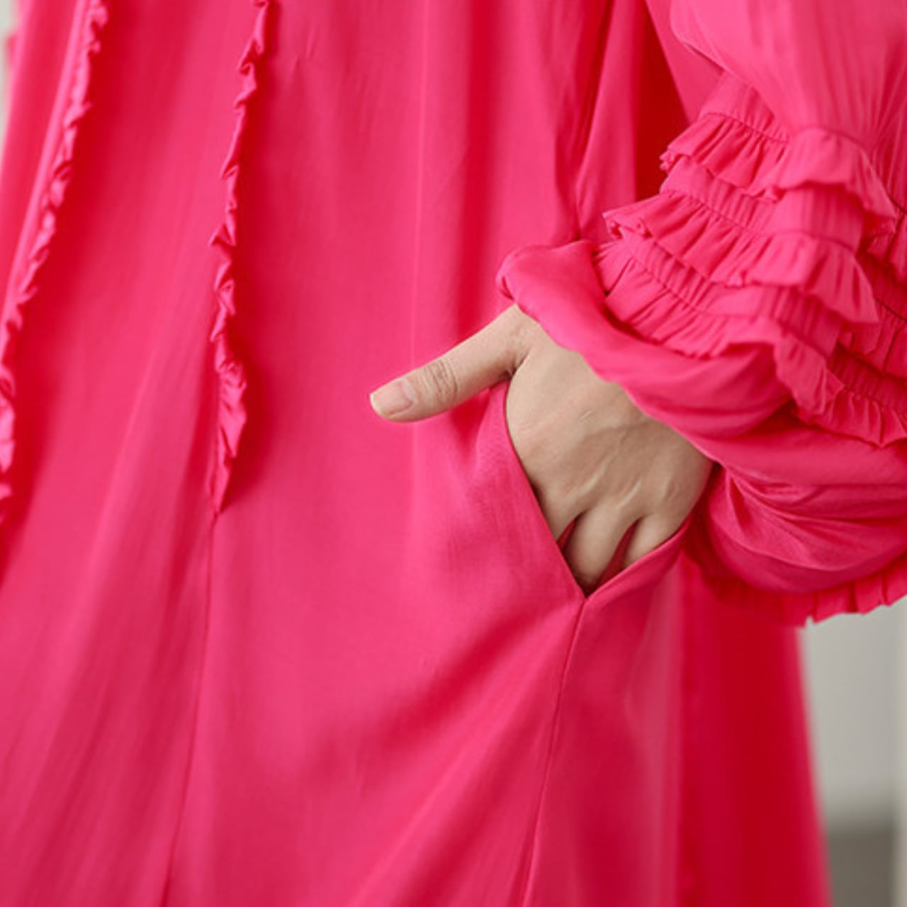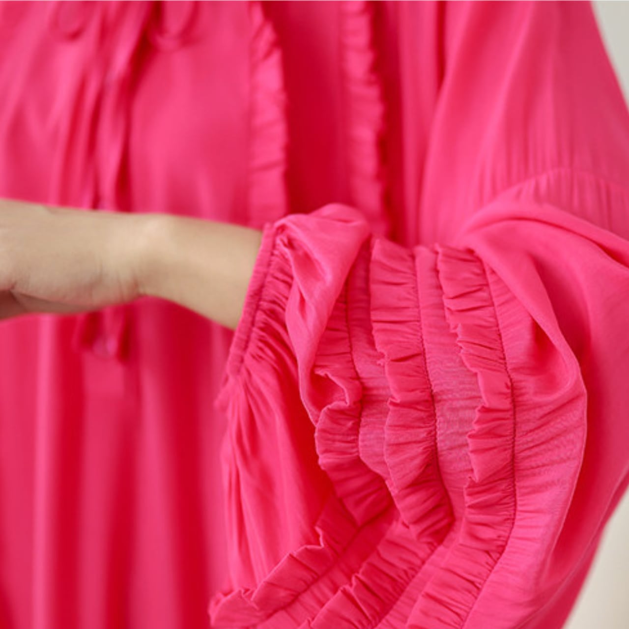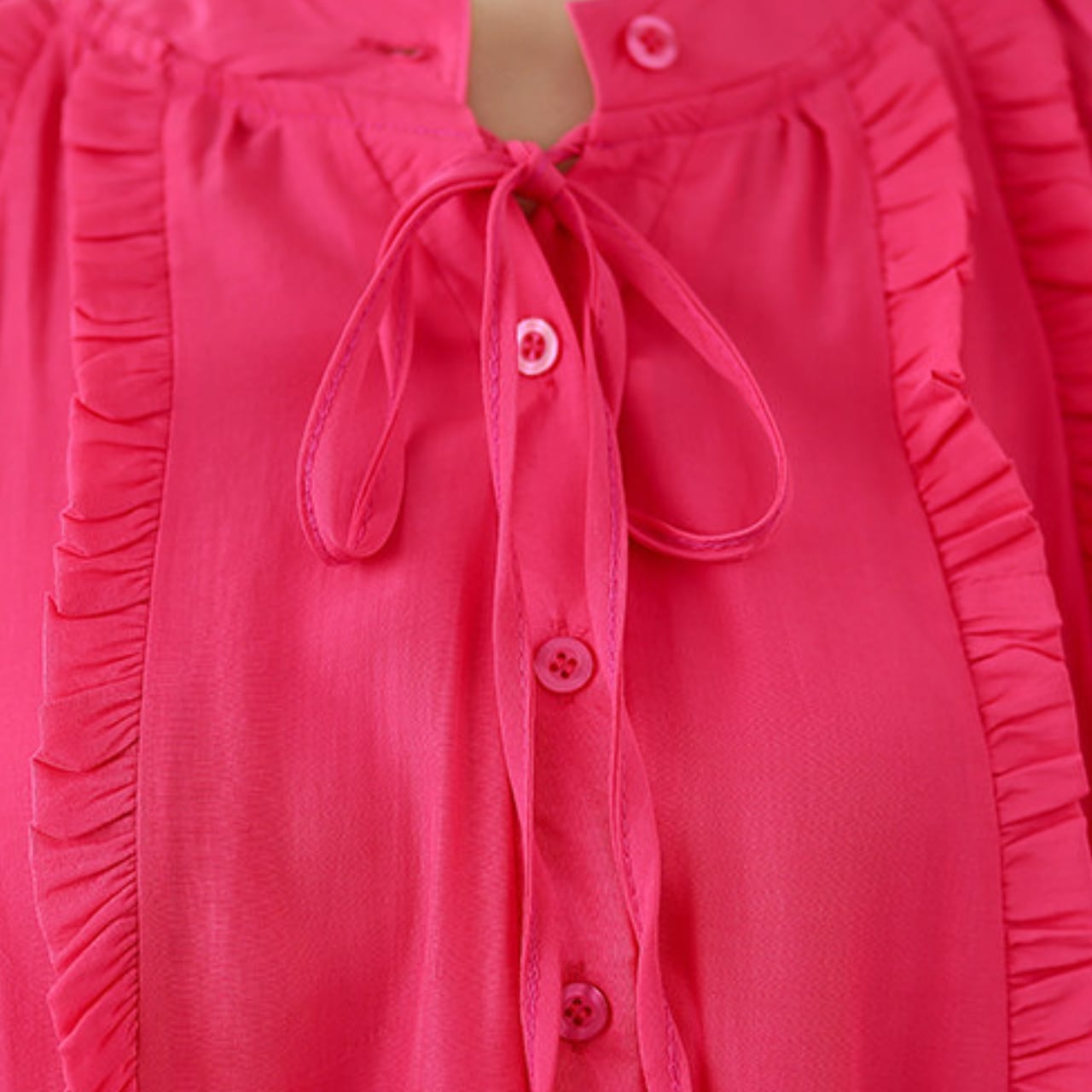ネックラインから前立て、袖口にかけてあしらわれたフリルが、さりげない華やかさをプラスします。