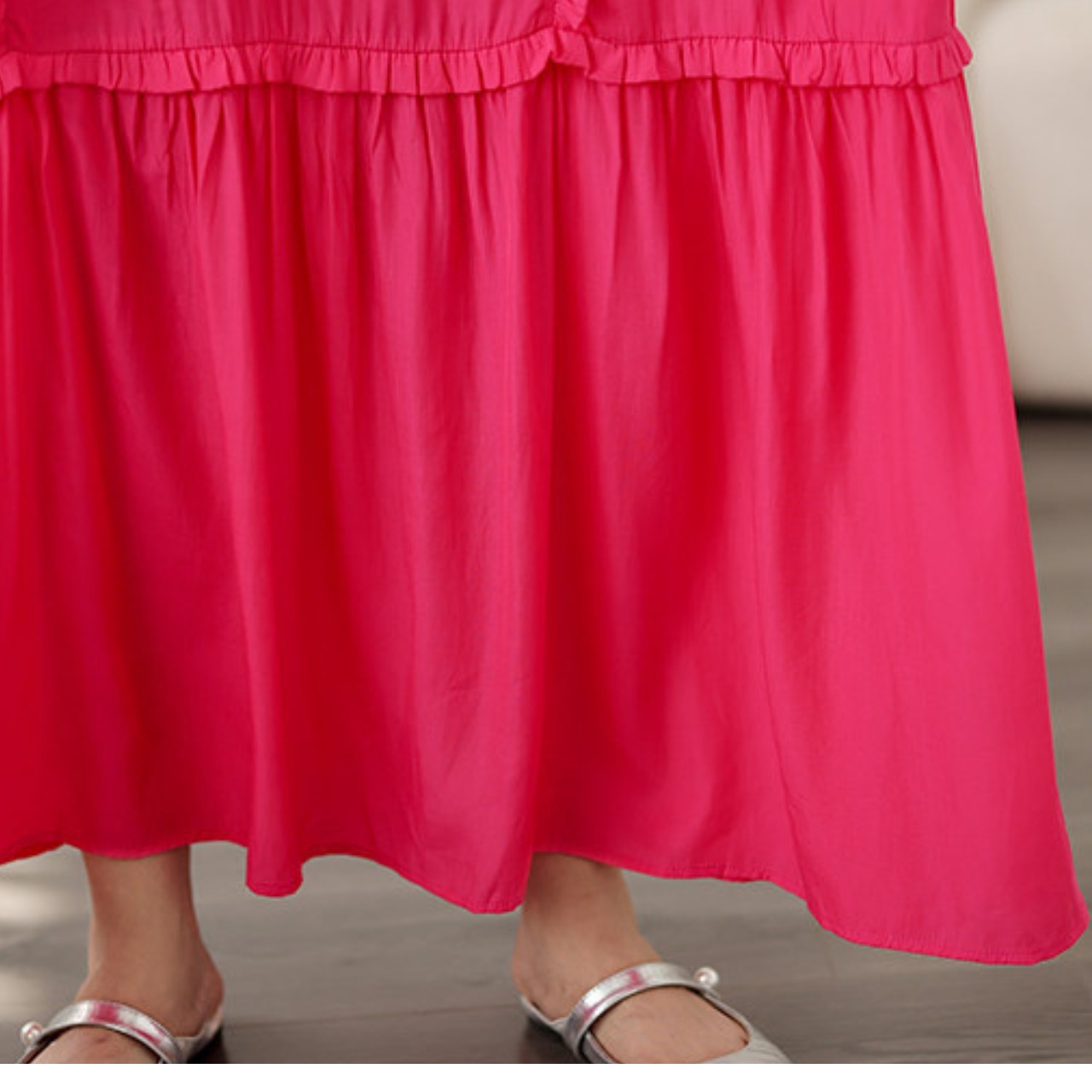 繊細なフリルが上品な印象を与えるミモレ丈ワンピースです。