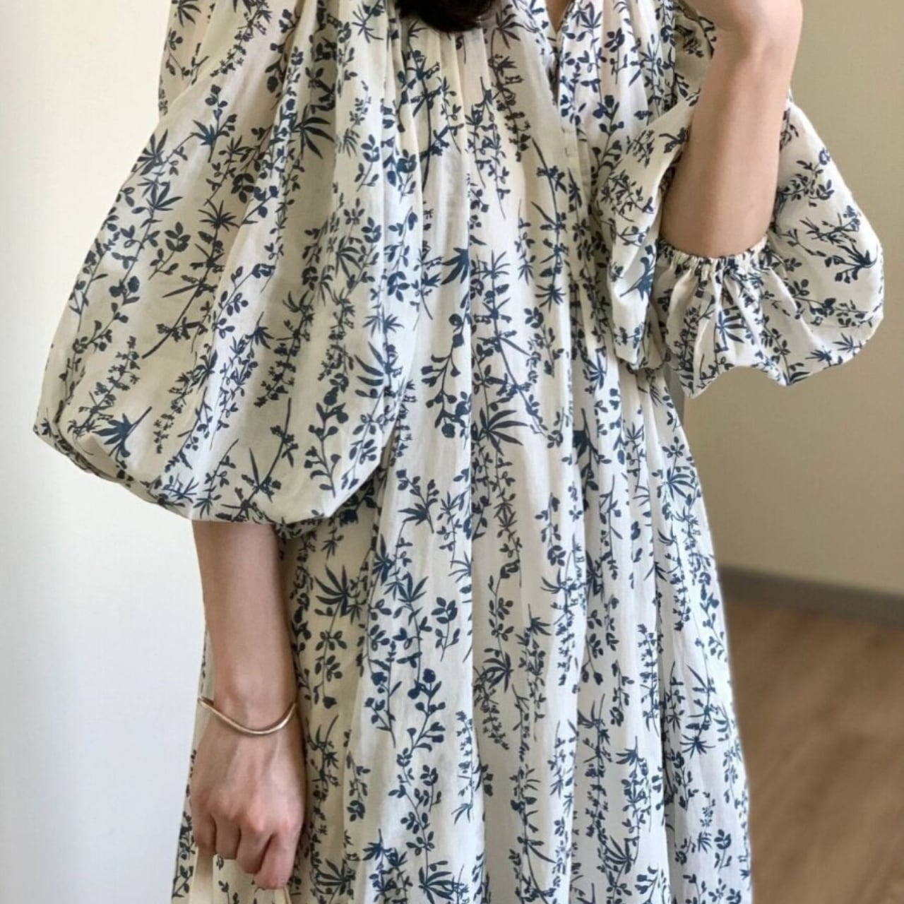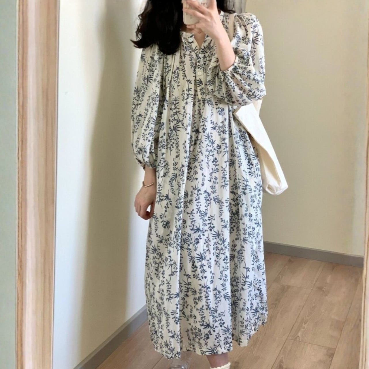 長袖 パフスリーブ ミモレ丈 ワンピース f-0009
