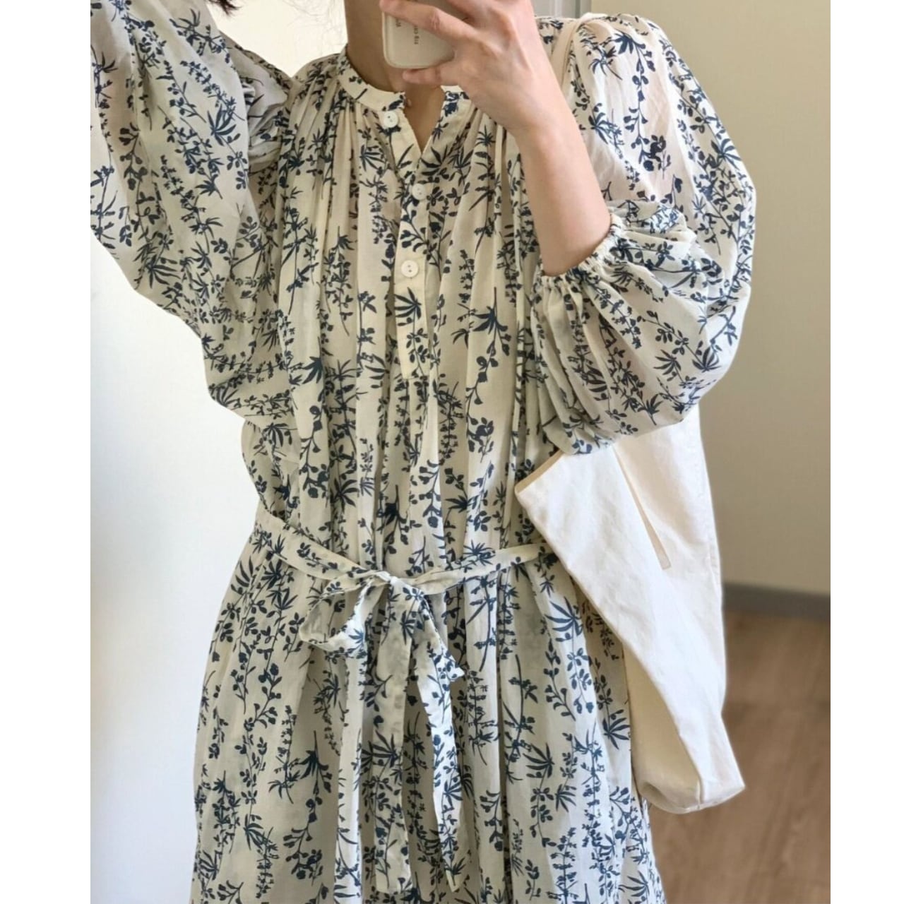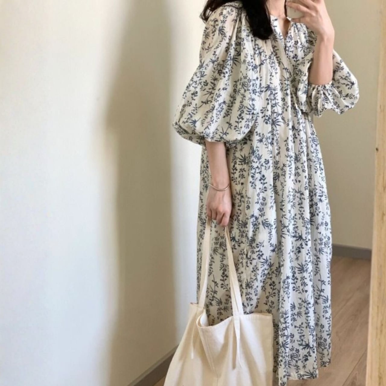 ふんわりとしたパフスリーブが印象的なミモレ丈ワンピースです。