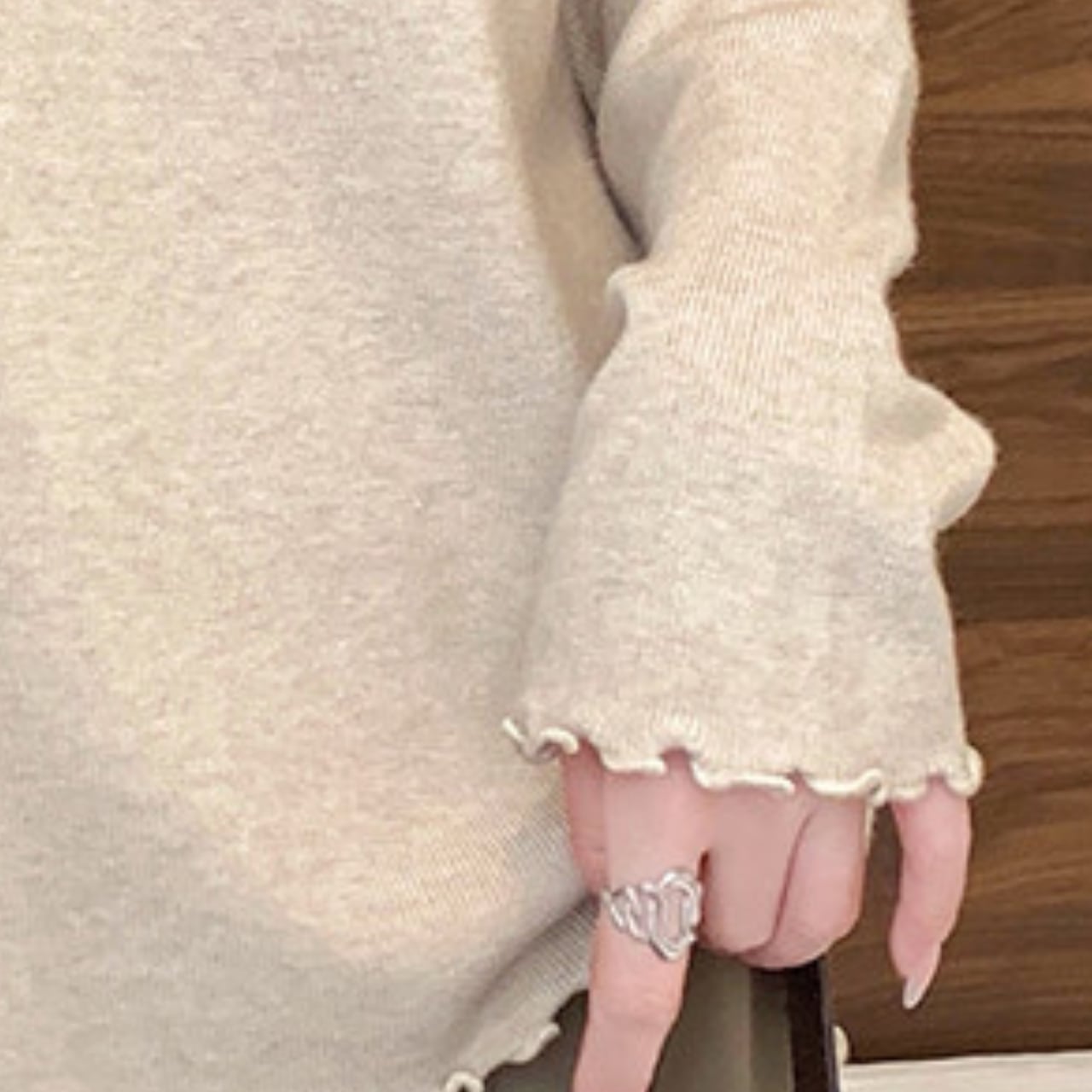 首元と袖口、裾にあしらわれたメロウフリルが、さりげない可愛らしさをプラスします。