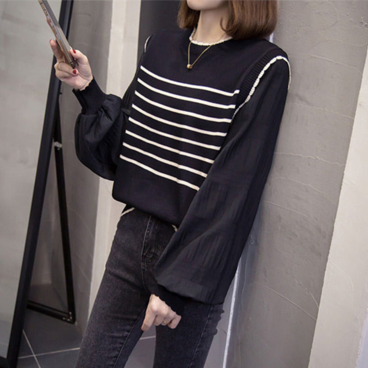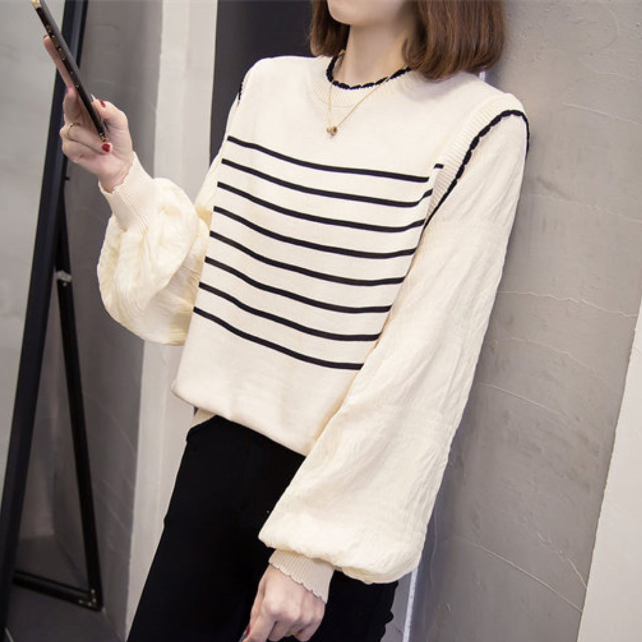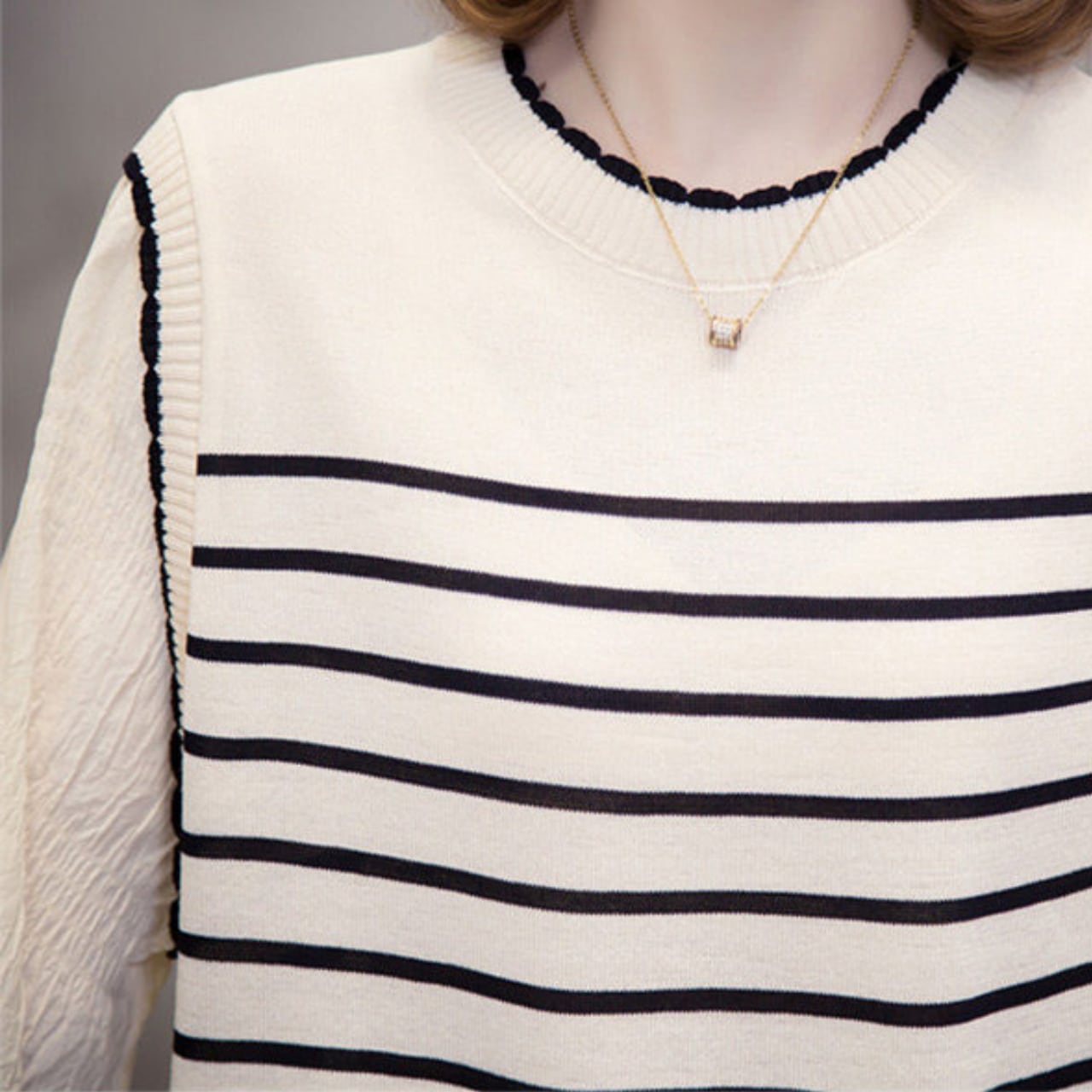 ニットとカットソーの組み合わせが新鮮な、フェイクツーピースデザインです。ボーダー柄ニットに袖はふんわりとしたボリュームスリーブのカットソーで、トレンド感のある着こなしが叶います。