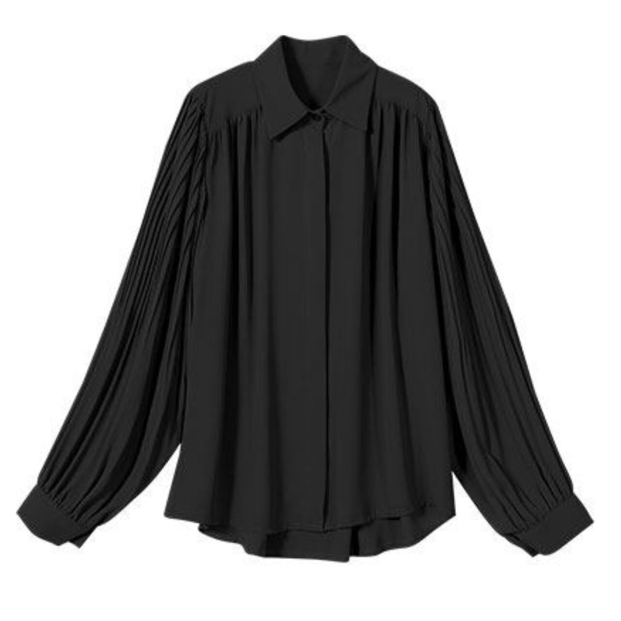 プリーツデザインが目を引く、上品な印象の長袖シャツブラウスです。