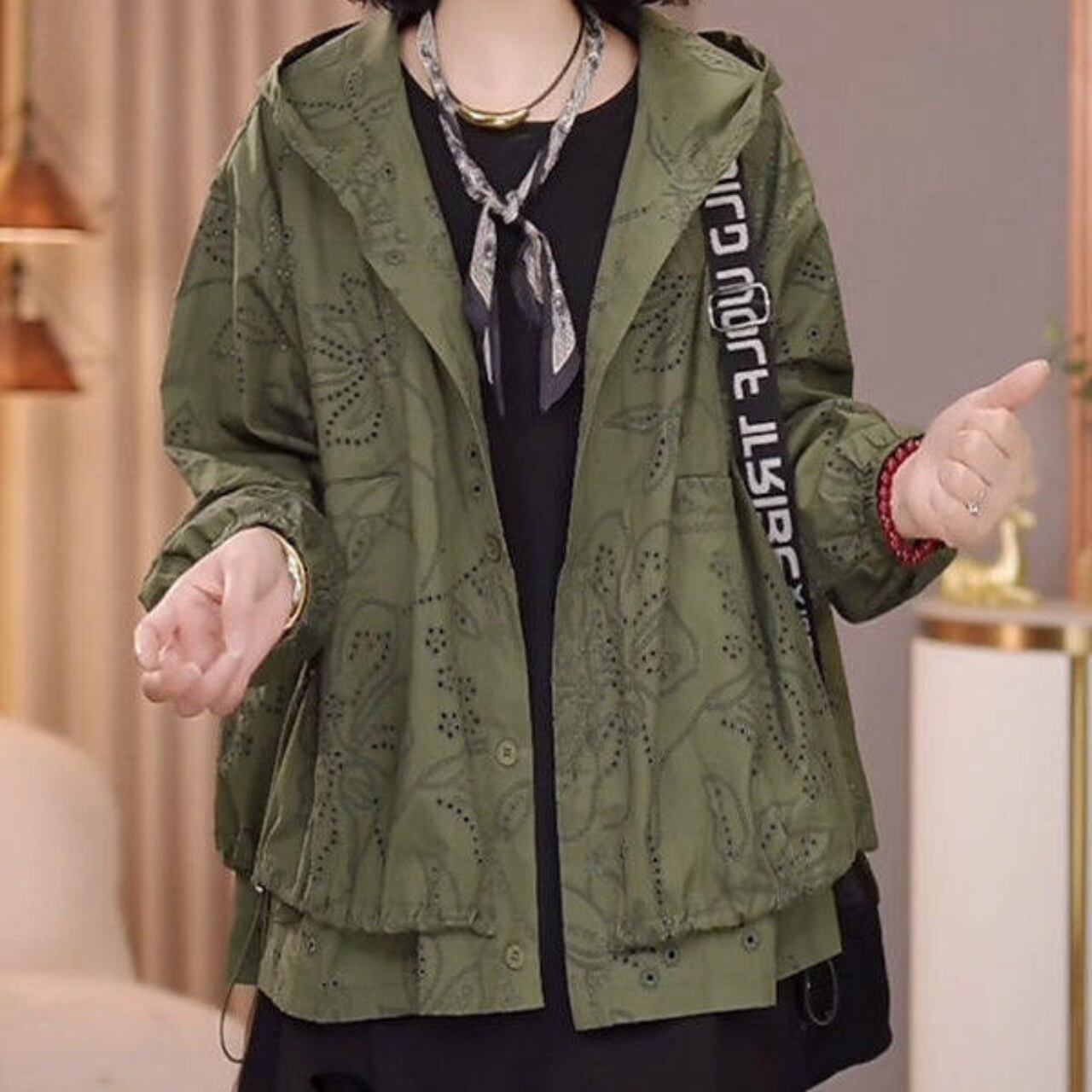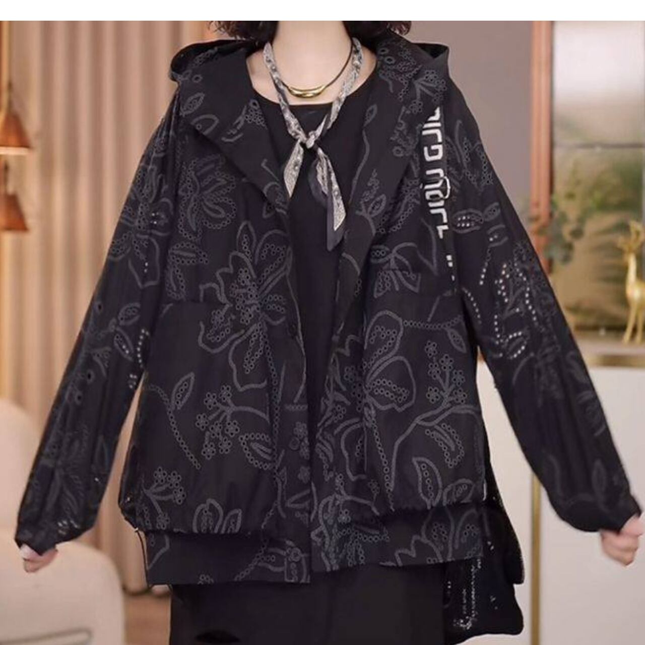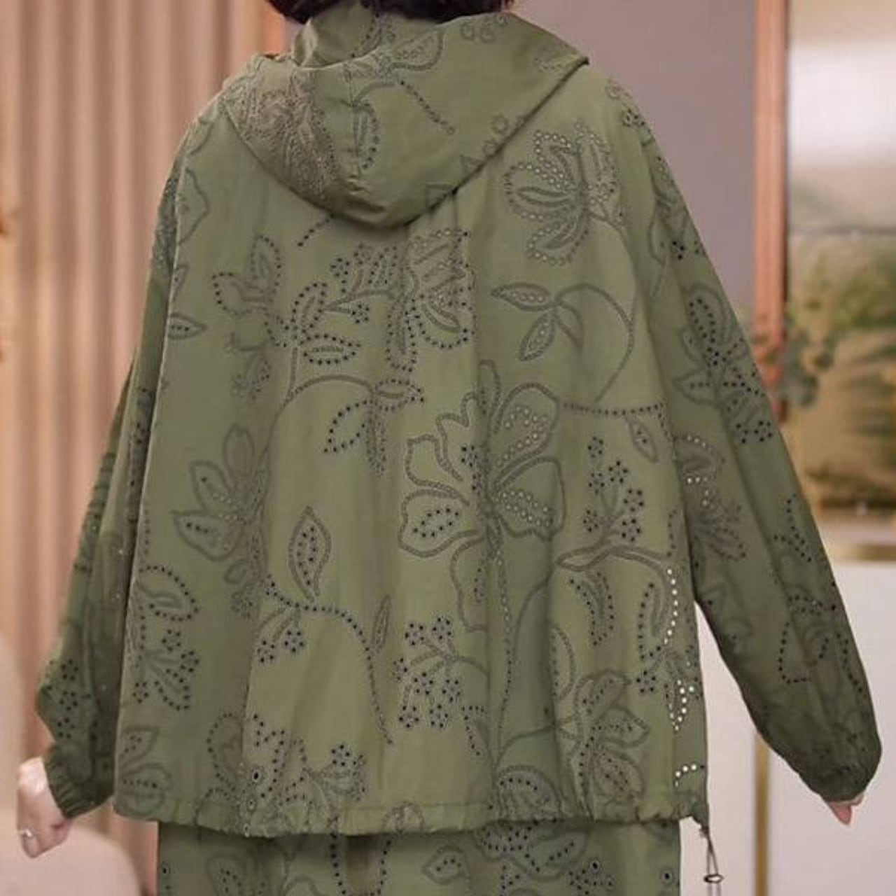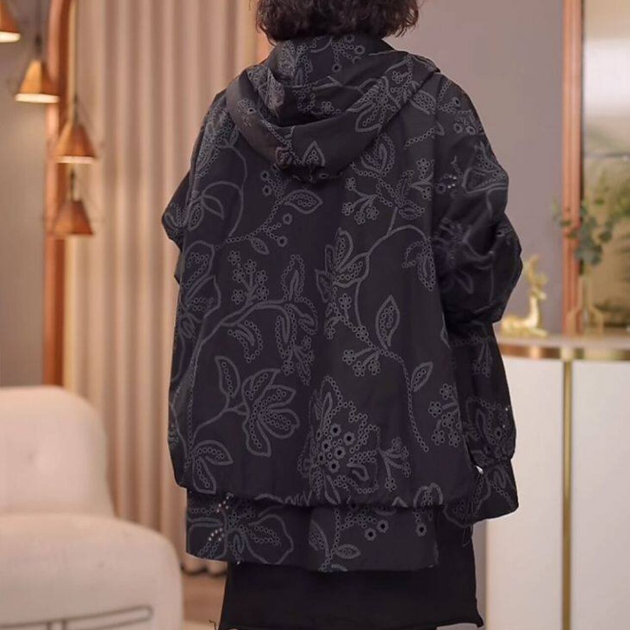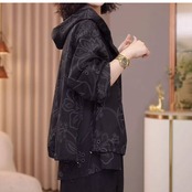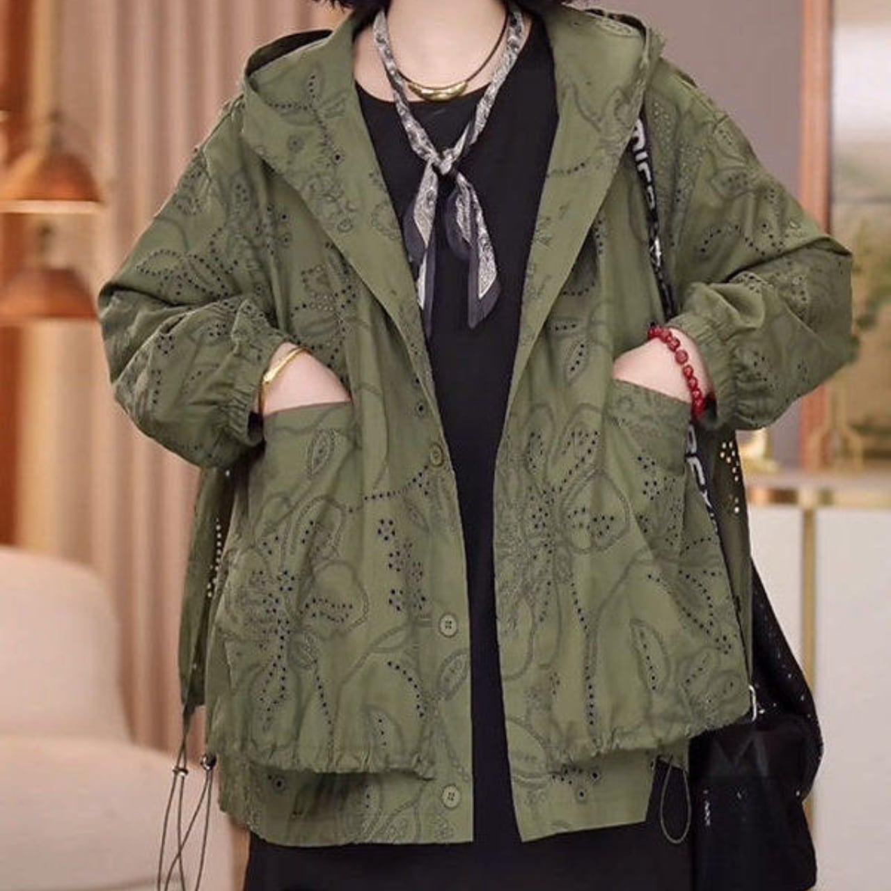 カジュアルながらも上品な印象を与えるフード付きジャケットです。