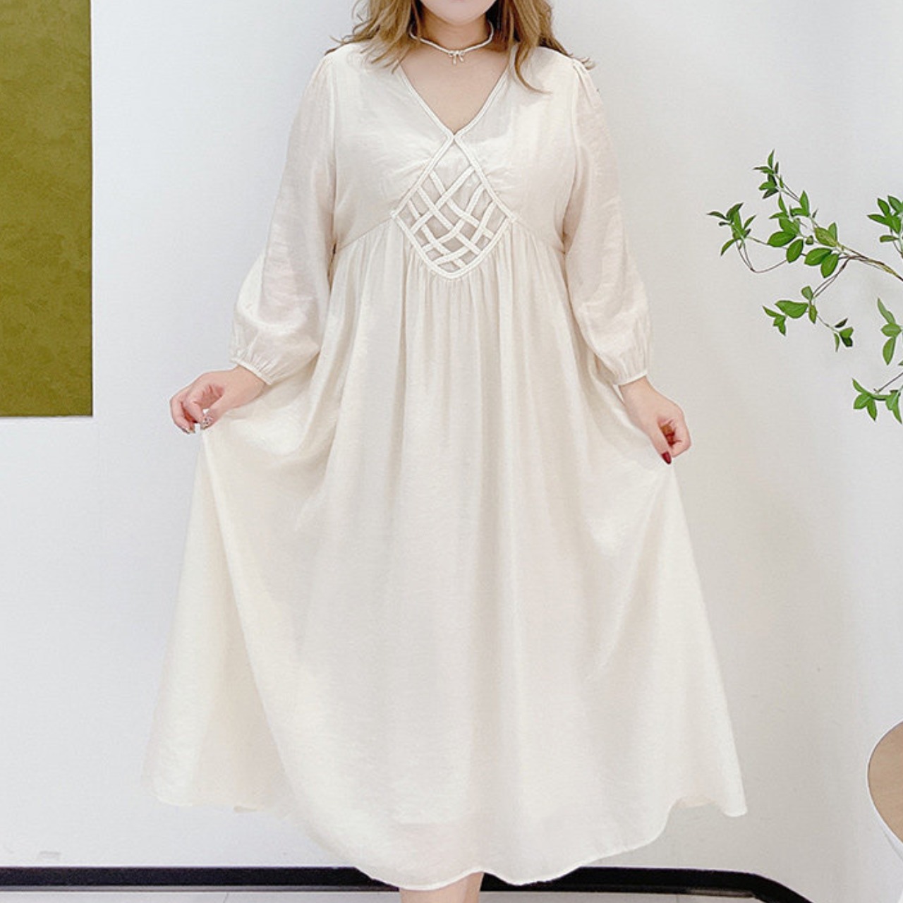 編み込み ミモレ丈 長袖 Aラインワンピース f0034