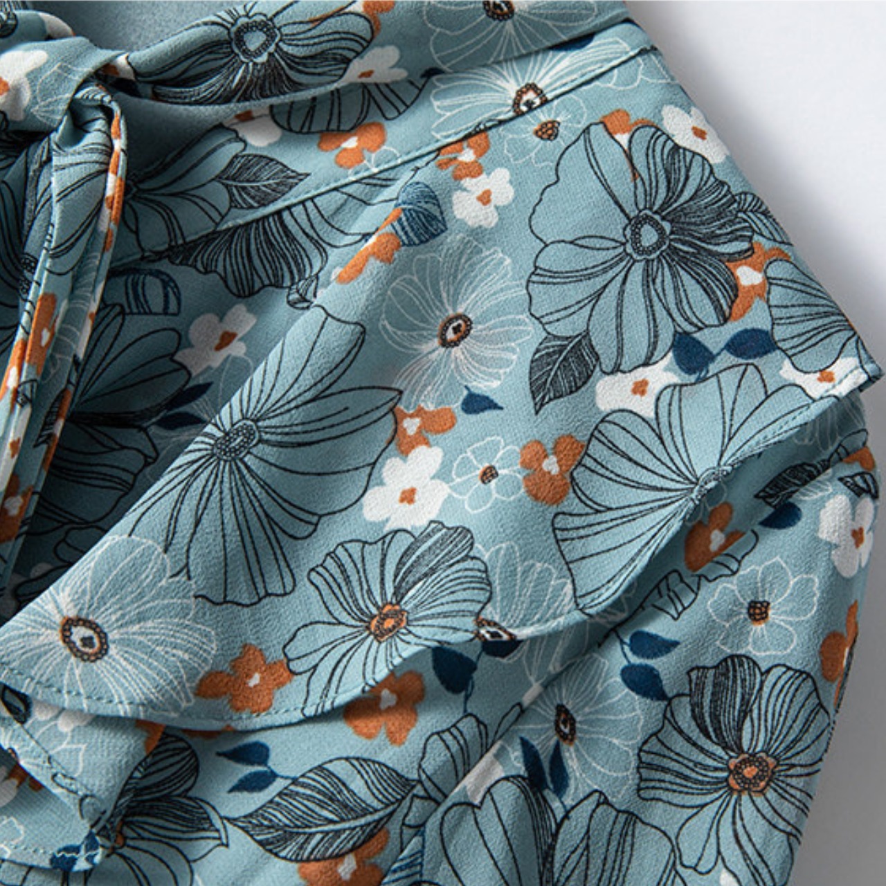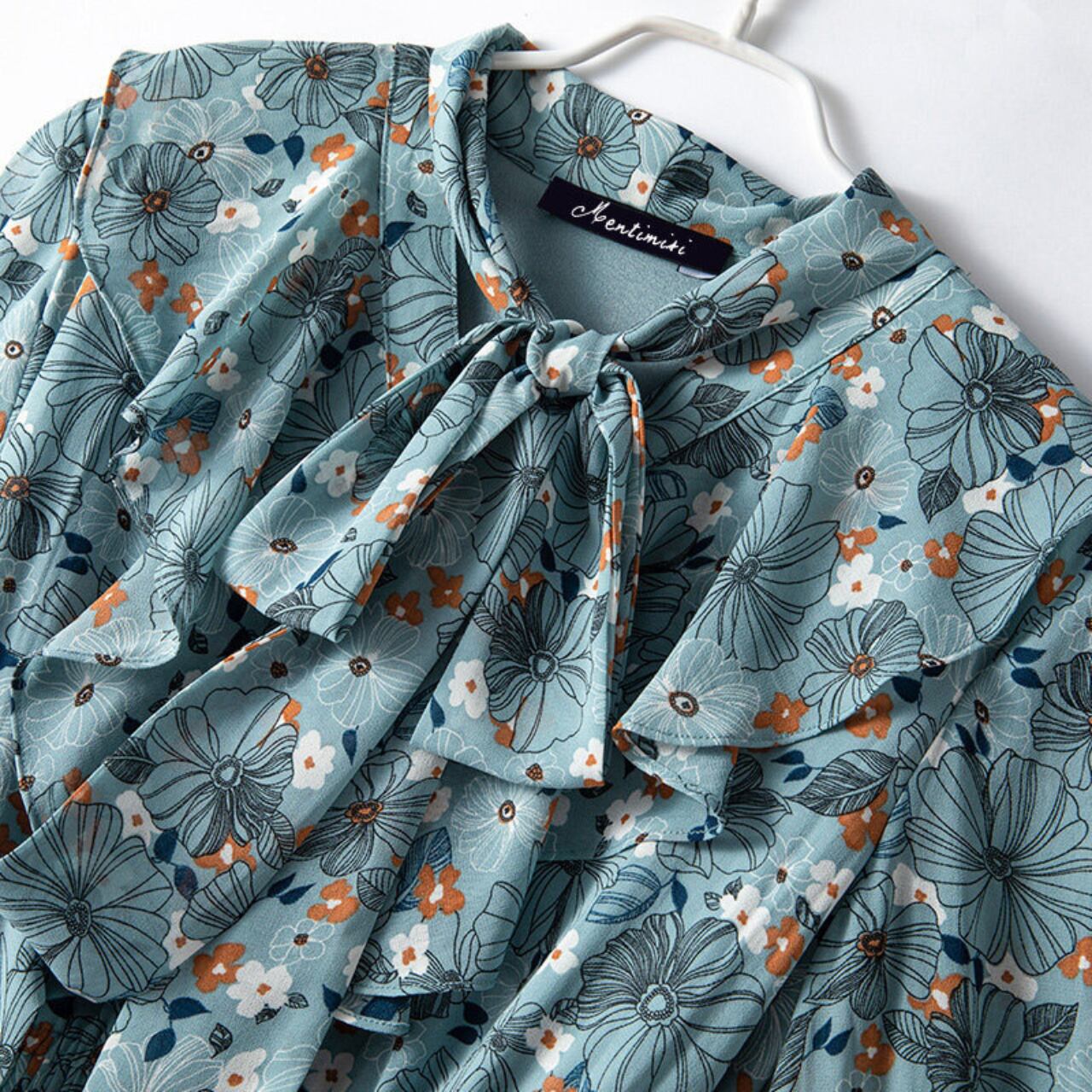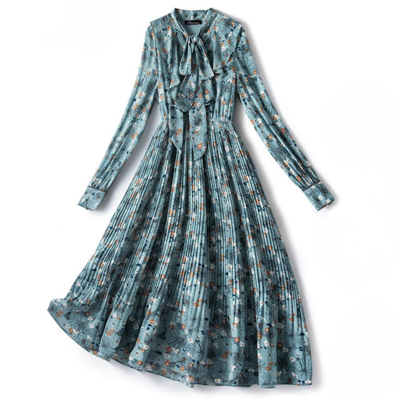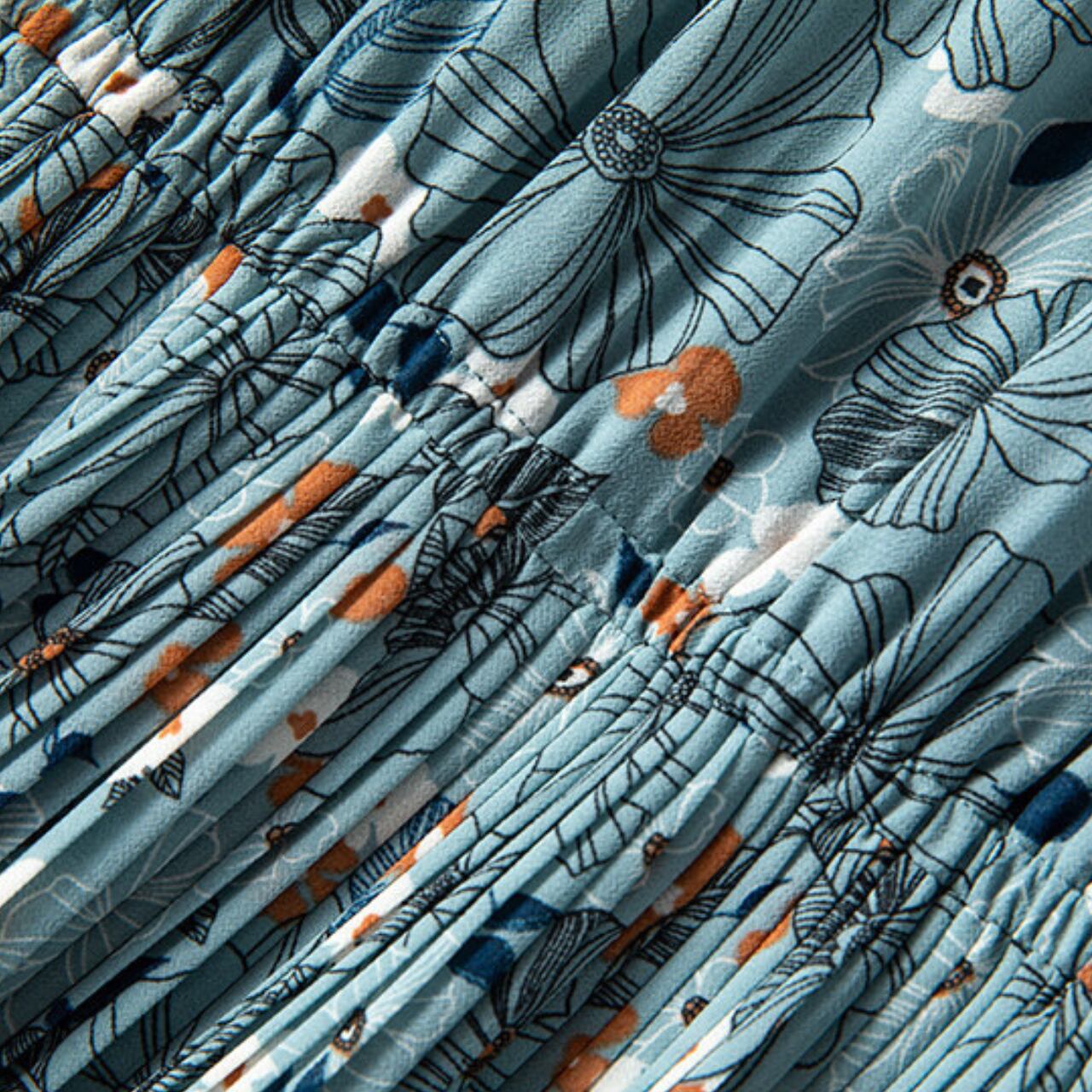 花柄プリント プリーツ ミモレ丈 ボウタイワンピース f0035