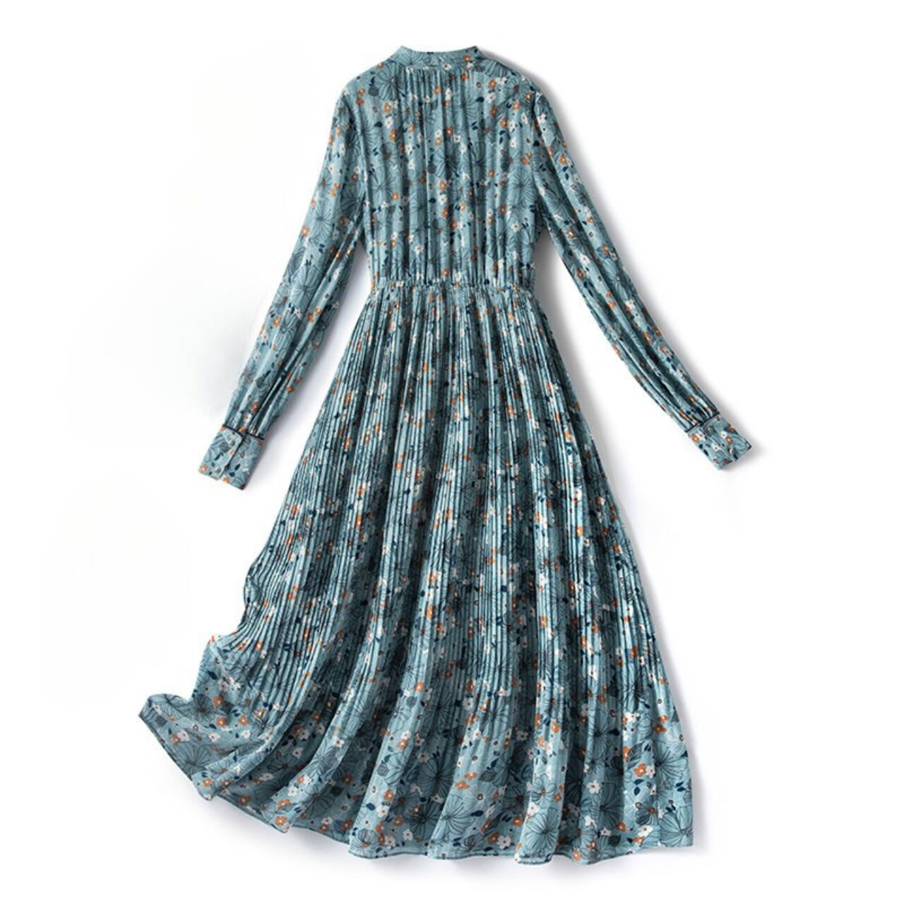 プリーツが軽やかに揺れる、ミモレ丈の長袖ワンピースです。