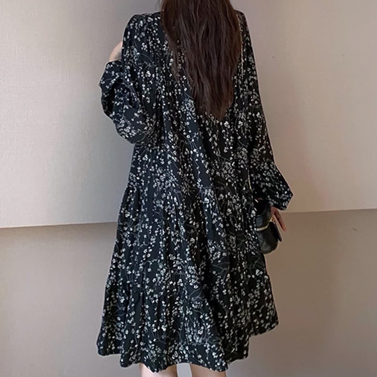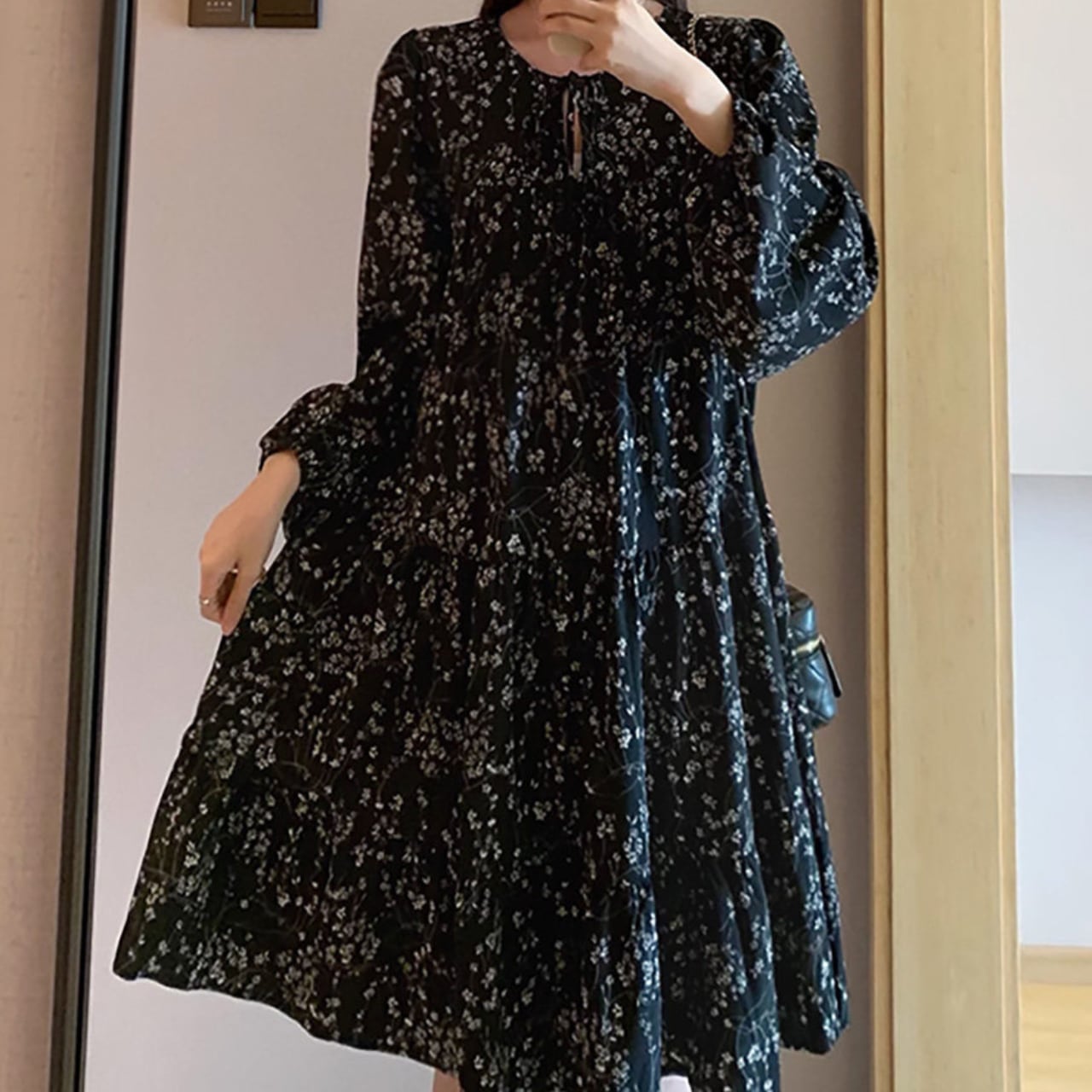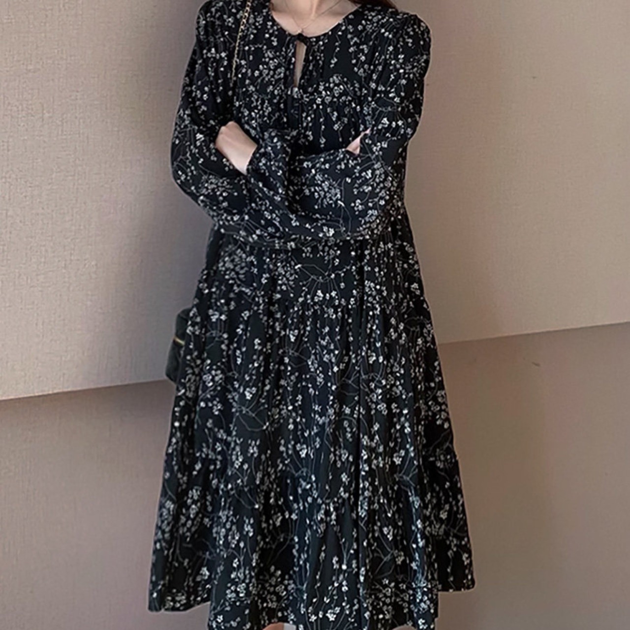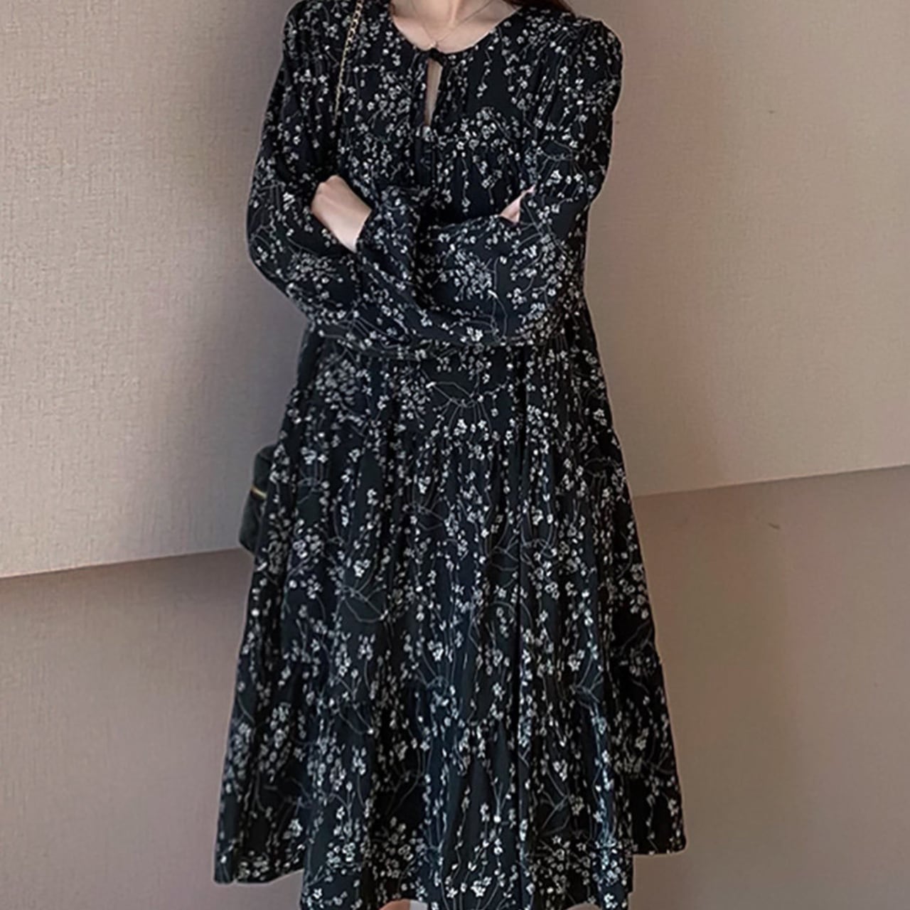 長袖 膝丈 花柄 ワンピース f0041