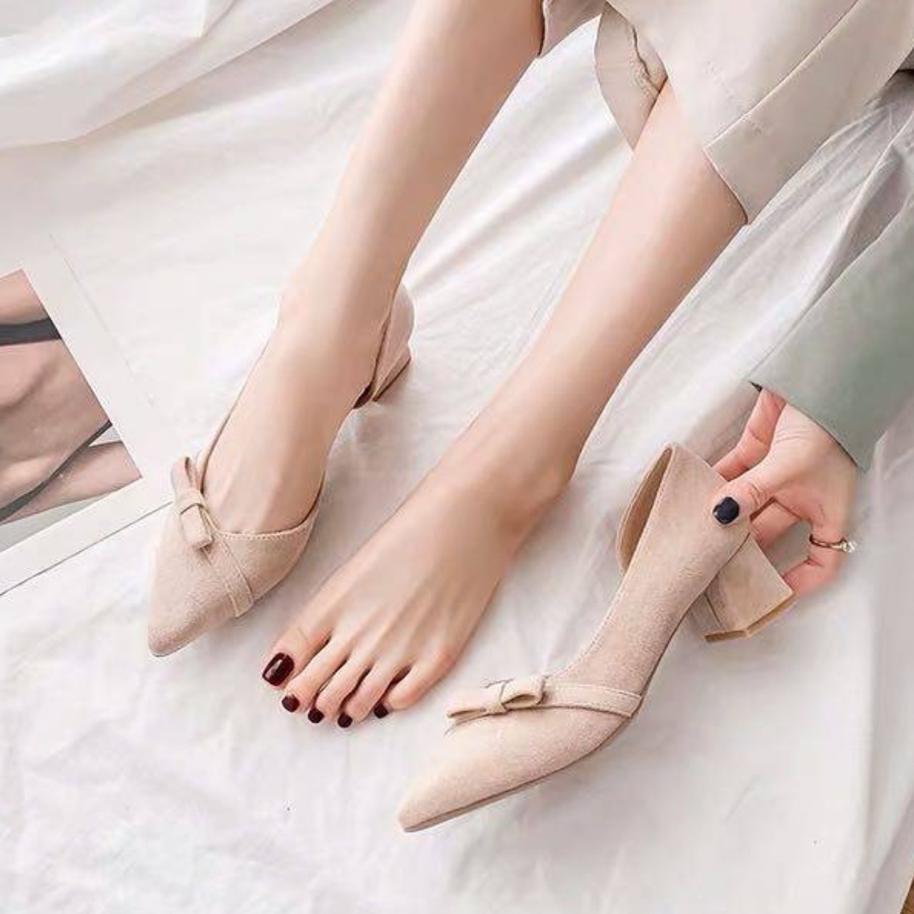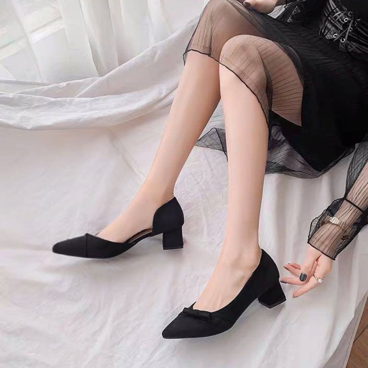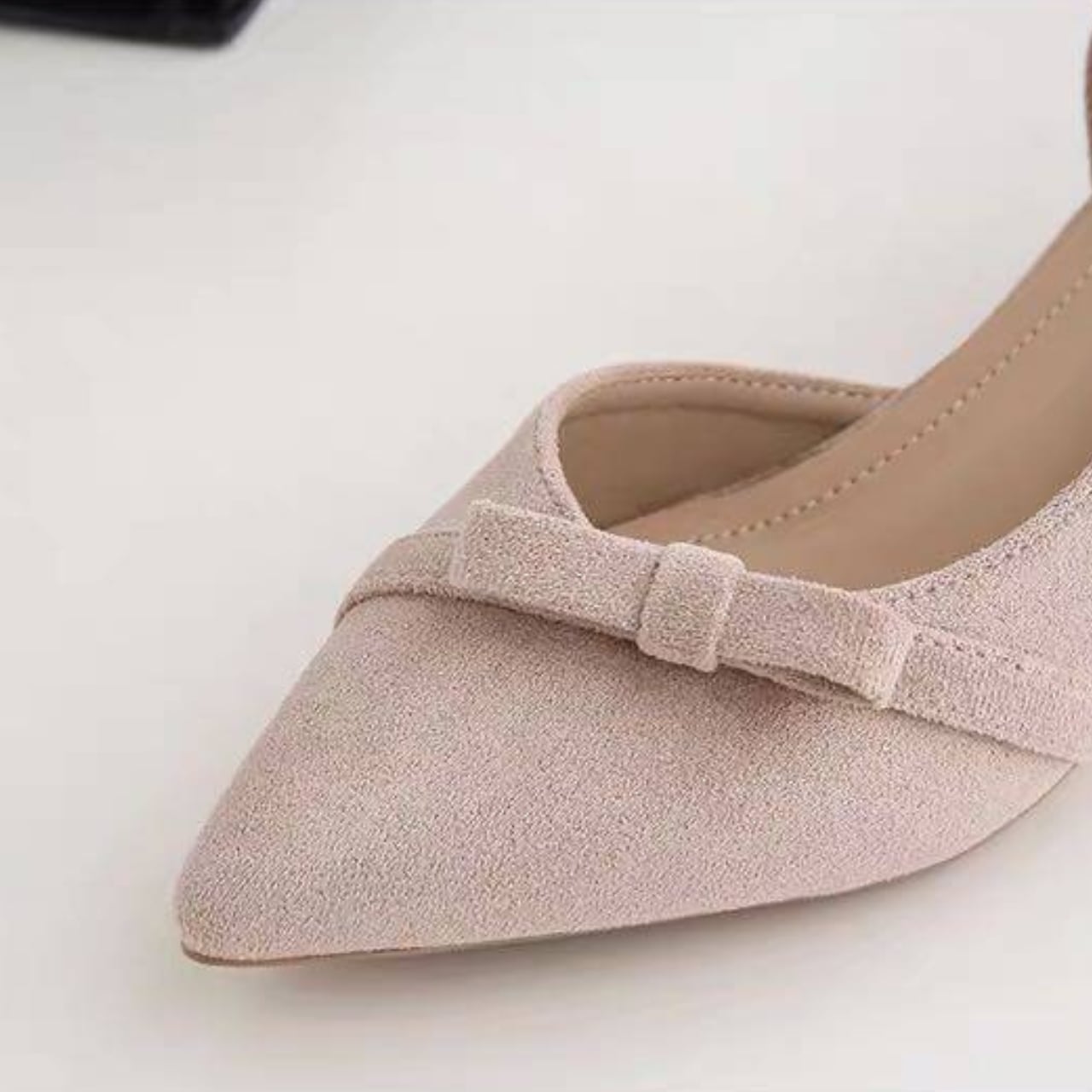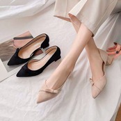 リボン ポインテッドトゥ ローヒール パンプス f0048
