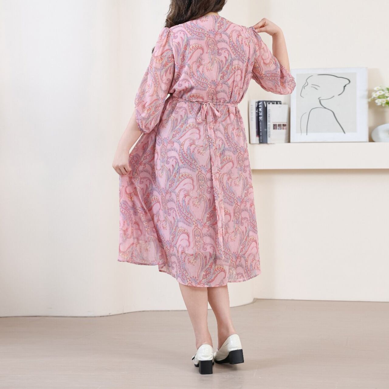 半袖 ウエスト切り替え ミモレ丈 ワンピース f0058