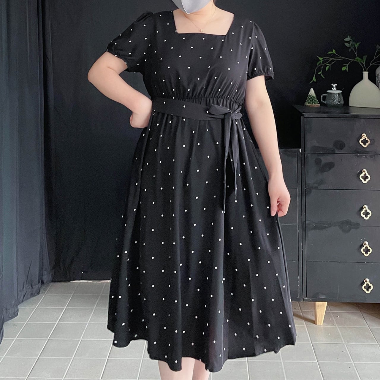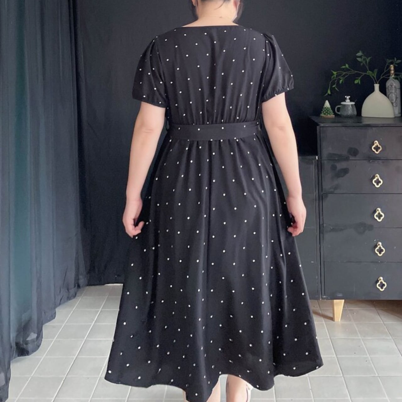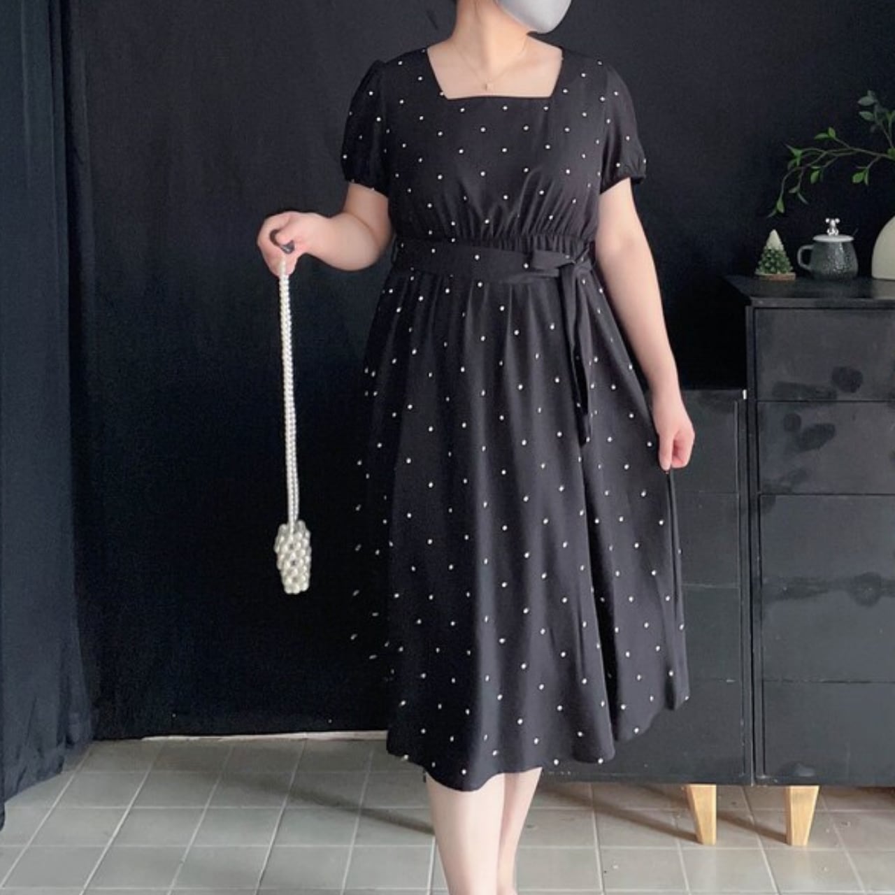 ドット柄が目を引く、フェミニンな印象のワンピースです。