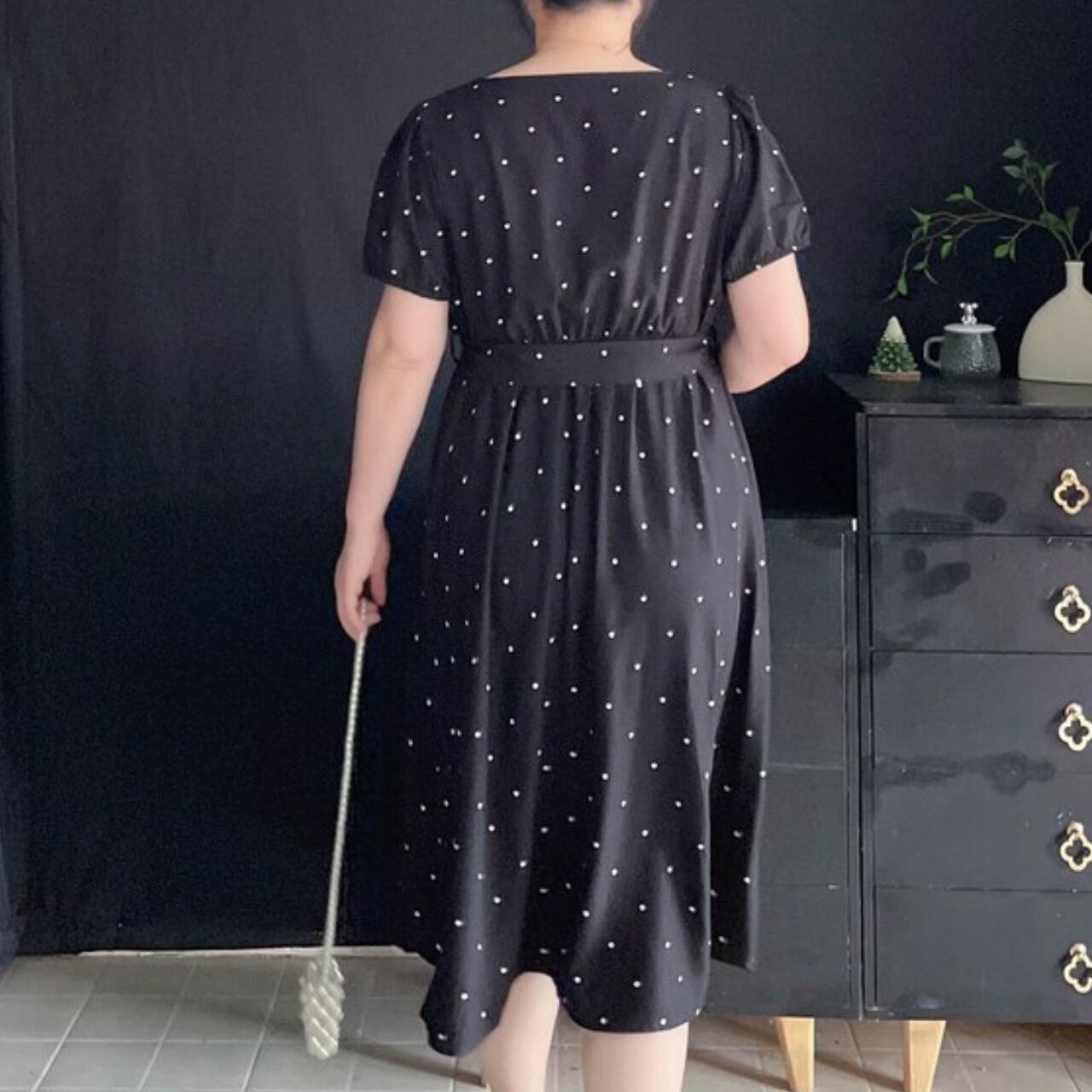 半袖 ウエストマーク ミモレ丈 ドット柄 ワンピース f0066