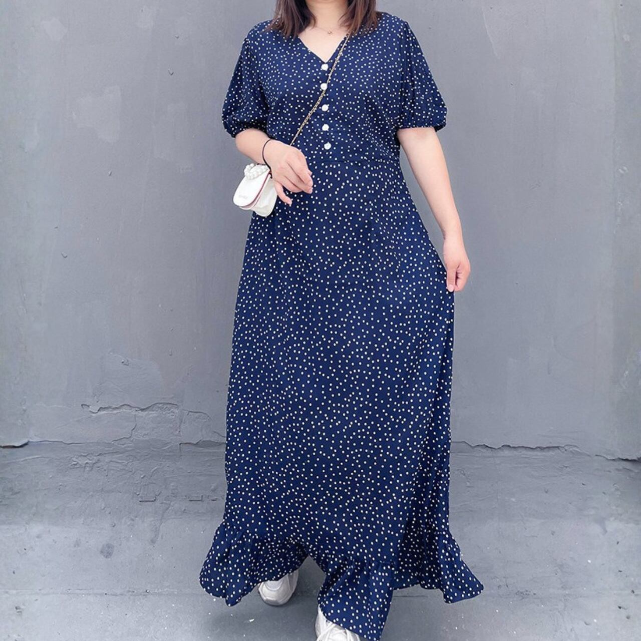 半袖 Vネック マキシ丈 ドットプリント ワンピース f0072
