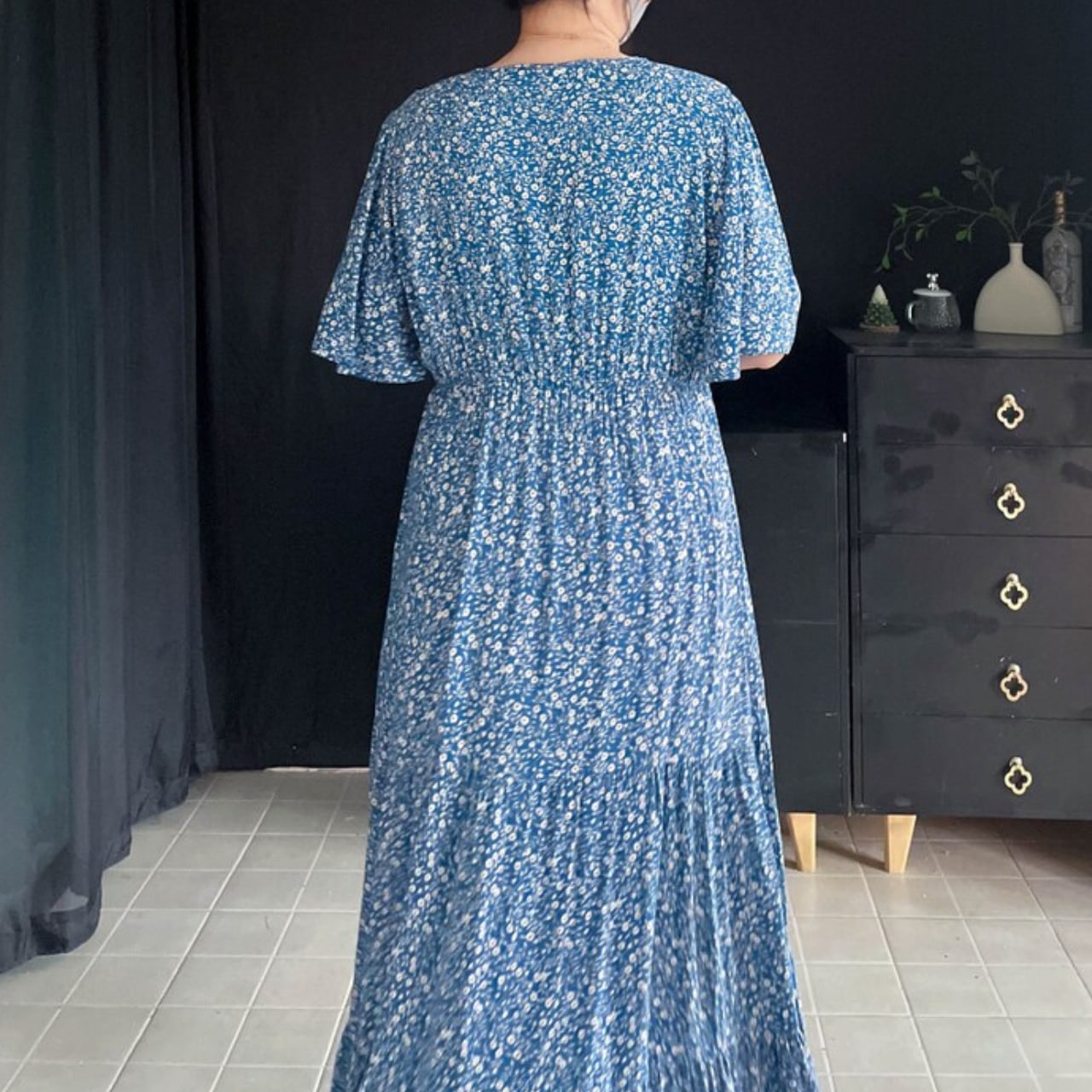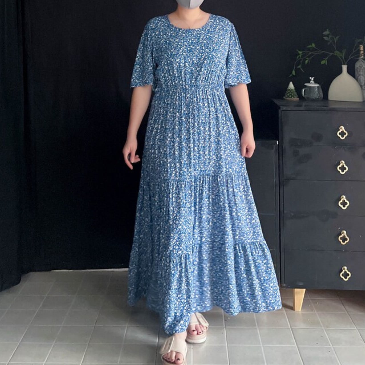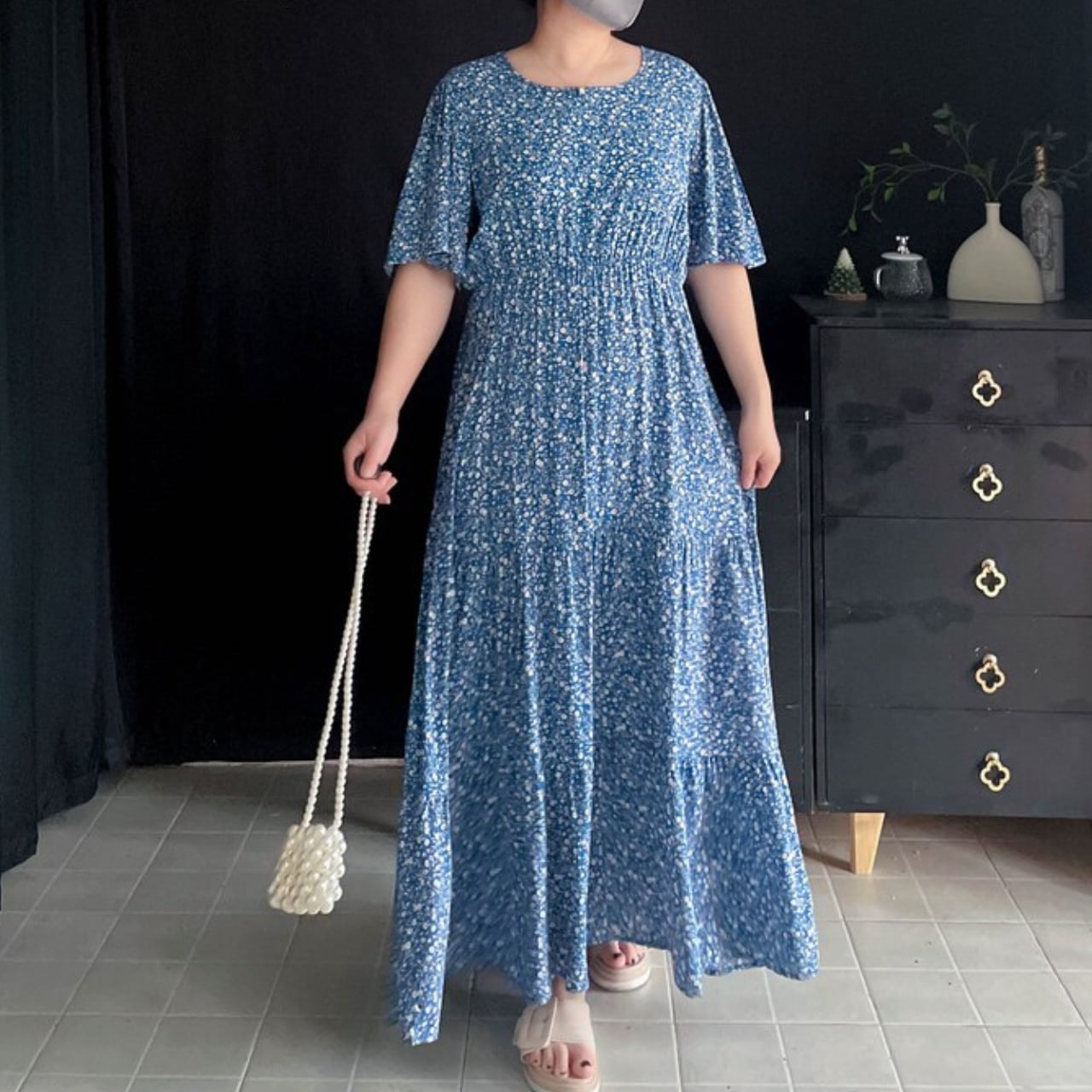 半袖 ウエストギャザー マキシ丈 ワンピース f0076