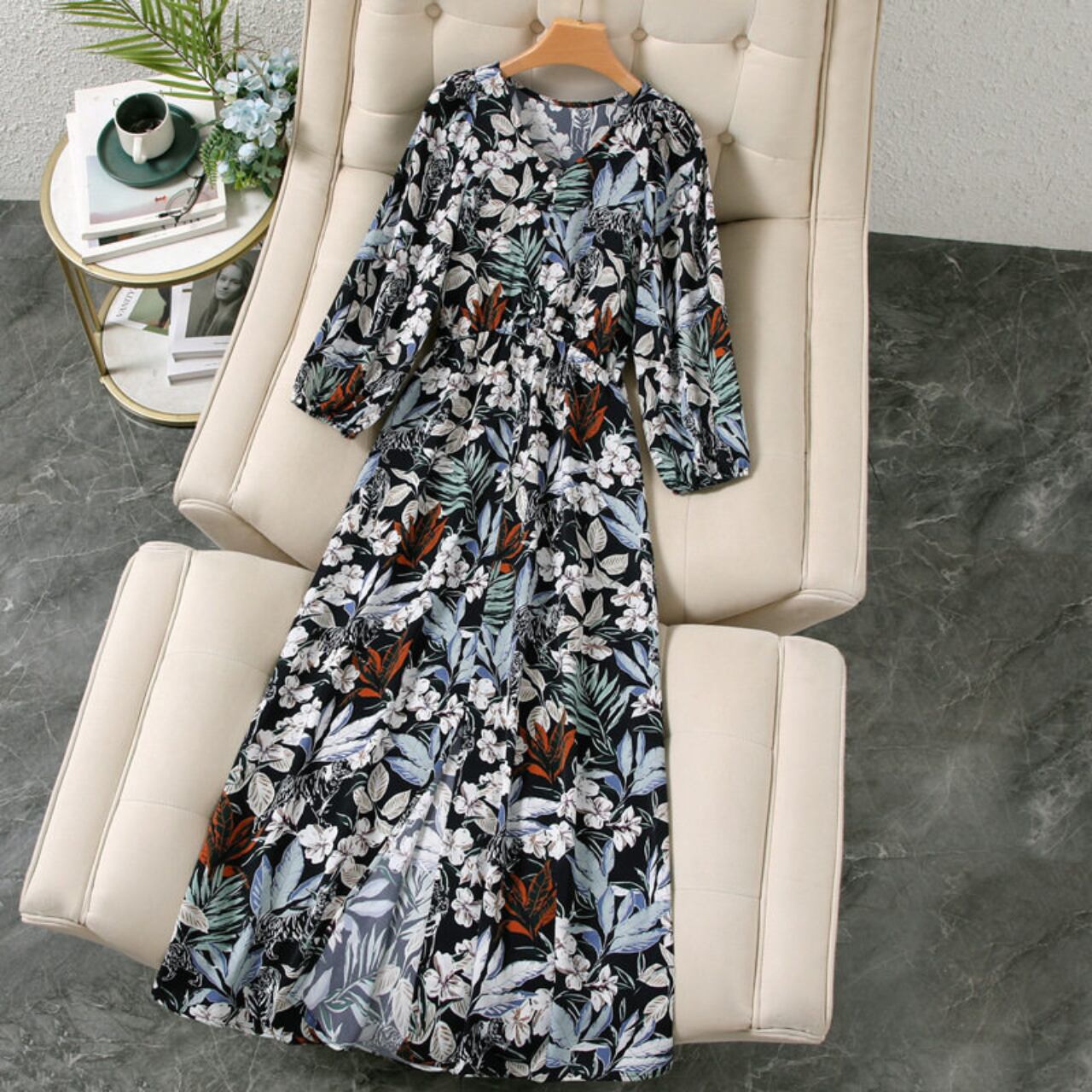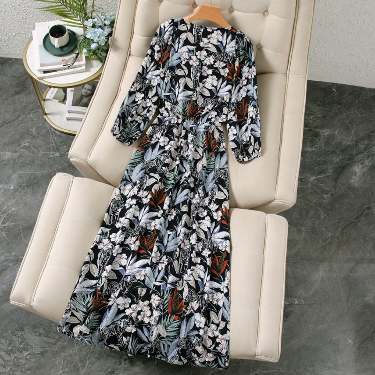 Vネック ミモレ丈 7分袖 シャツワンピース f0081