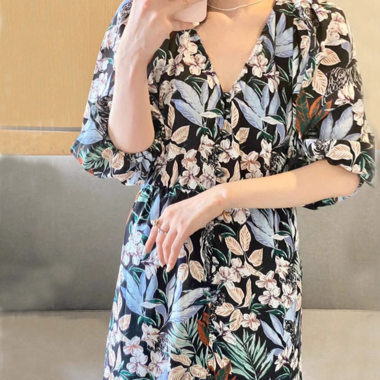 大人の女性に似合う、上品なミモレ丈ワンピース。