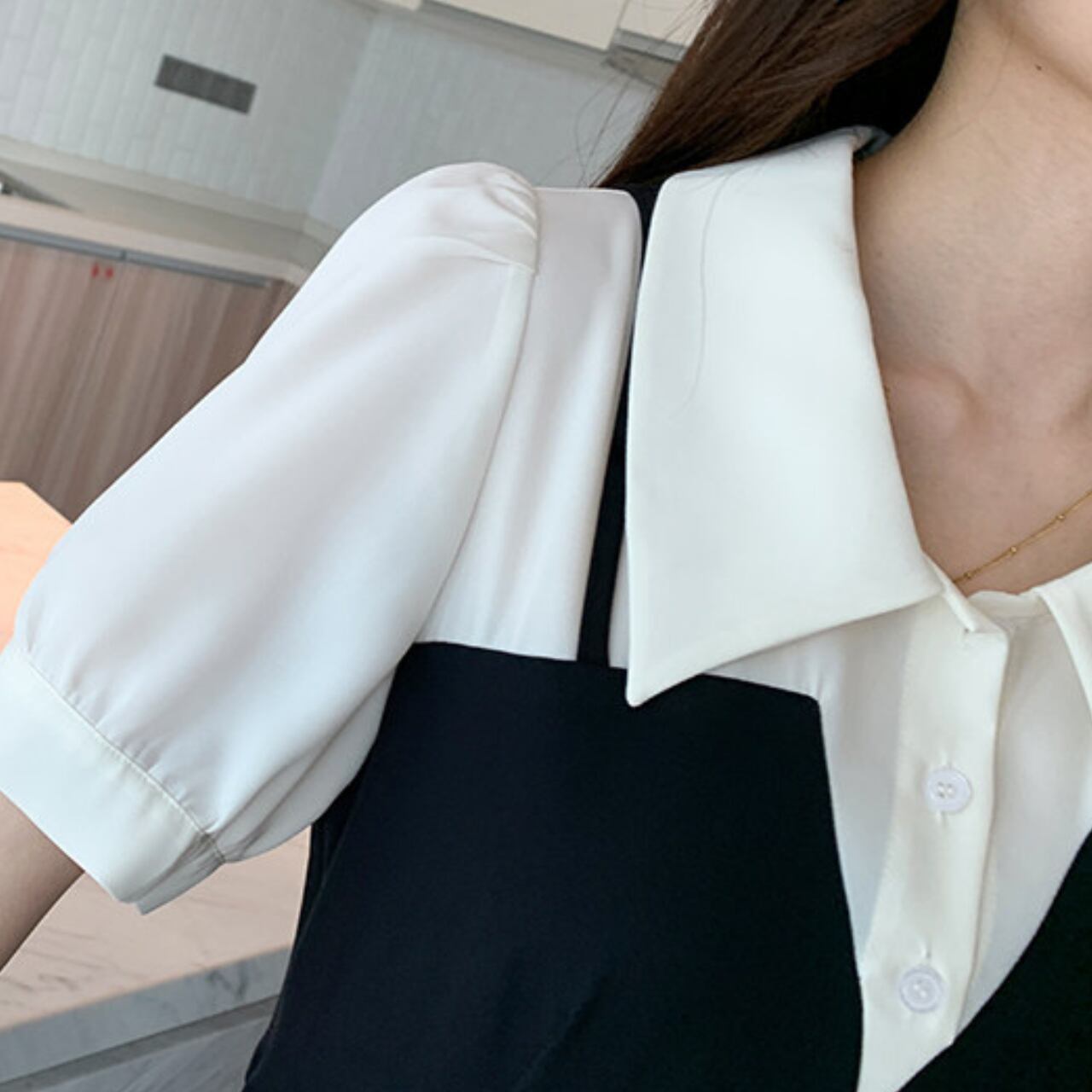 シャツカラーとキャミソールワンピースの組み合わせが、トレンド感あふれるレイヤードスタイルを演出します。