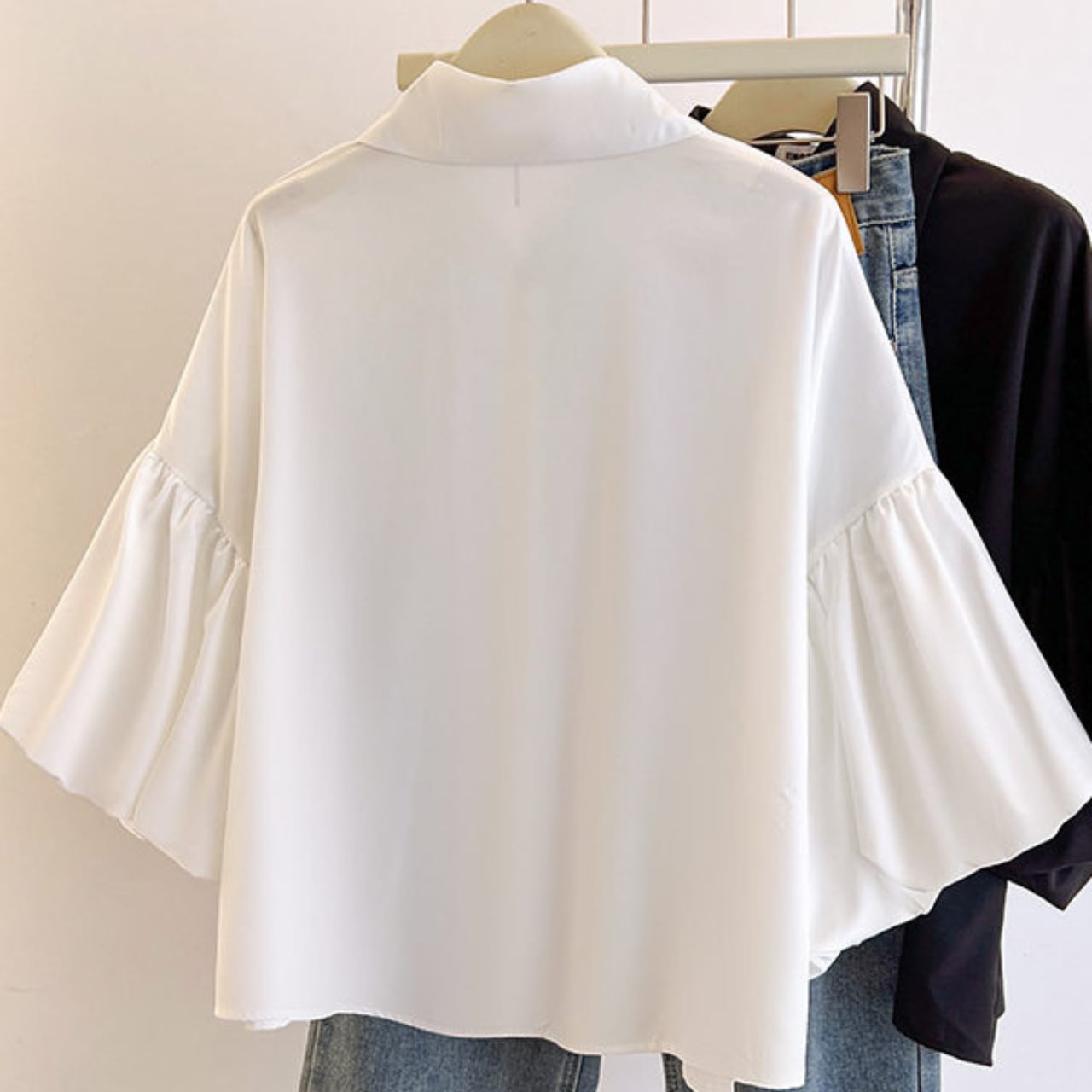 きちんと感とこなれ感を両立する、パフスリーブのシャツカラーブラウスです。