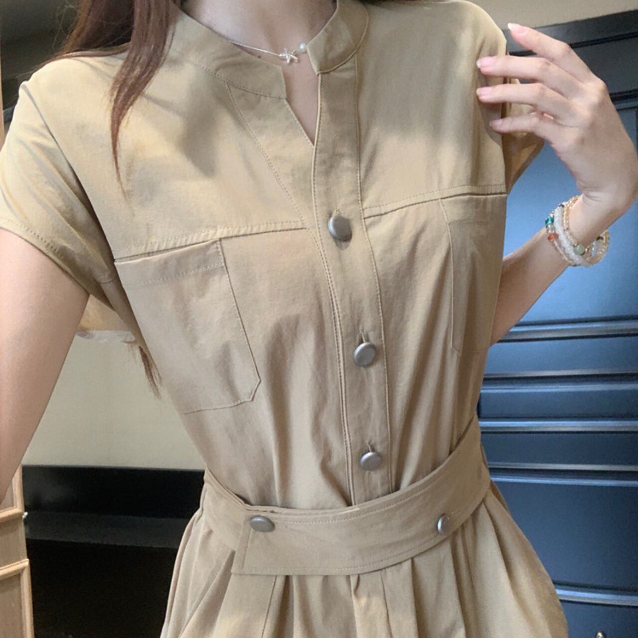 ボタンフロント ミモレ丈 半袖 ワンピース f0117
