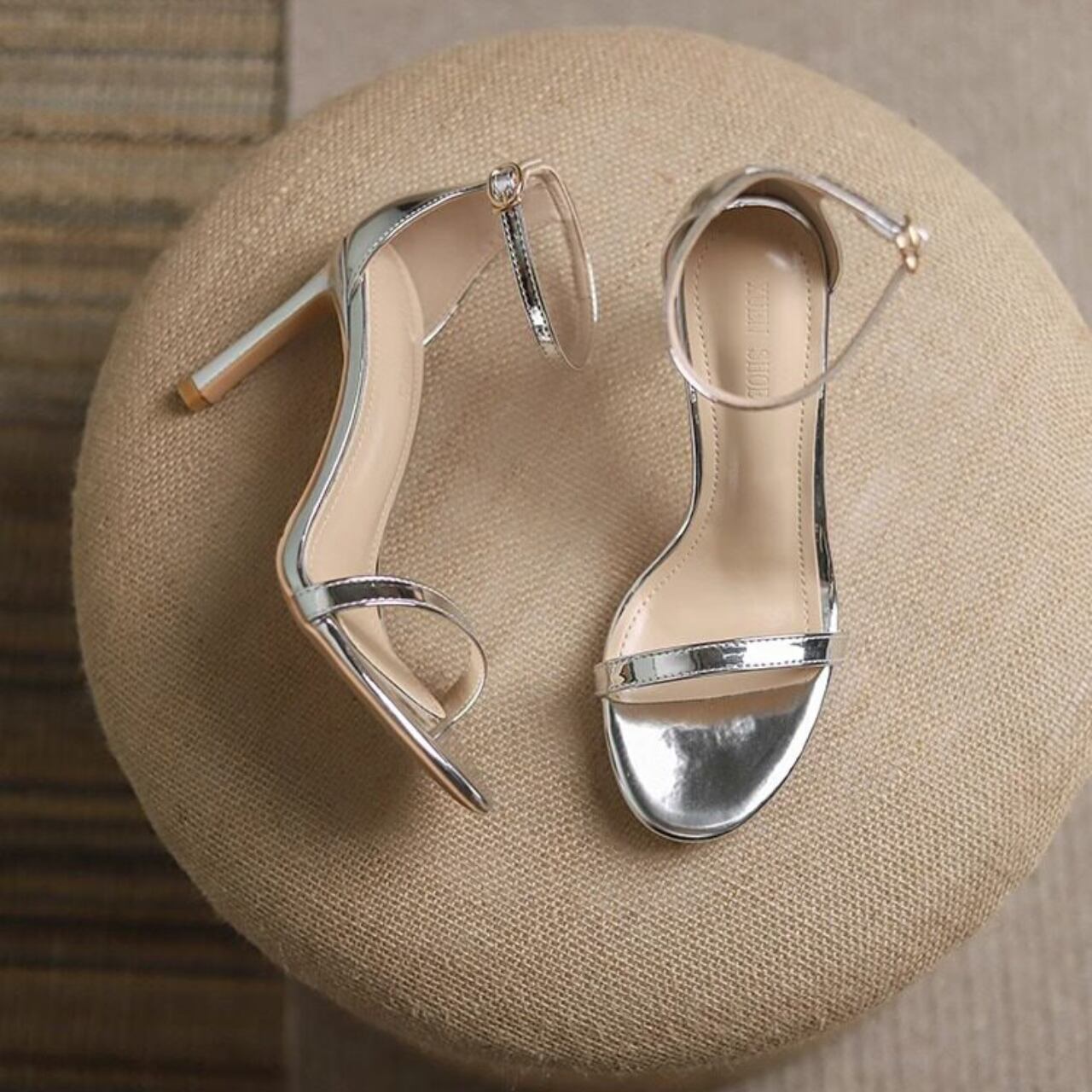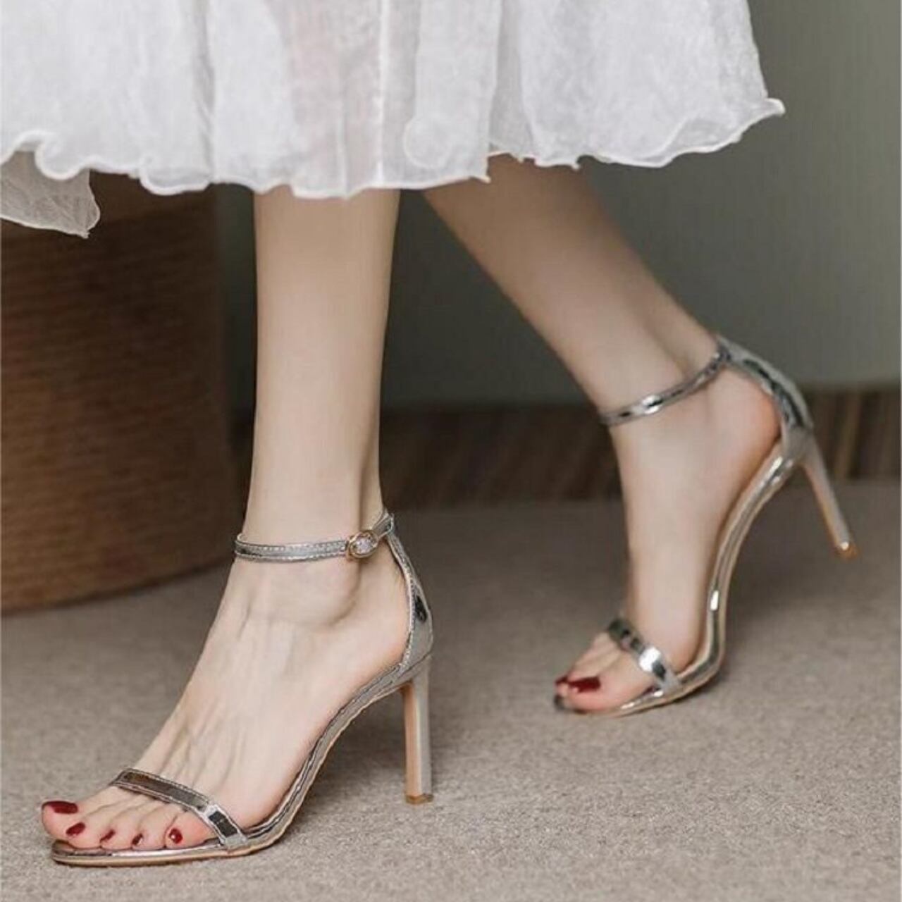 足元を華奢に演出するストラップ付きのピンヒールサンダル。