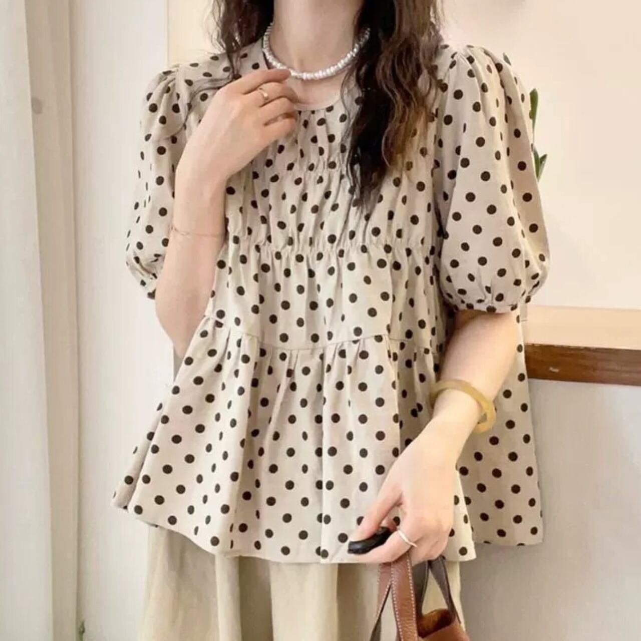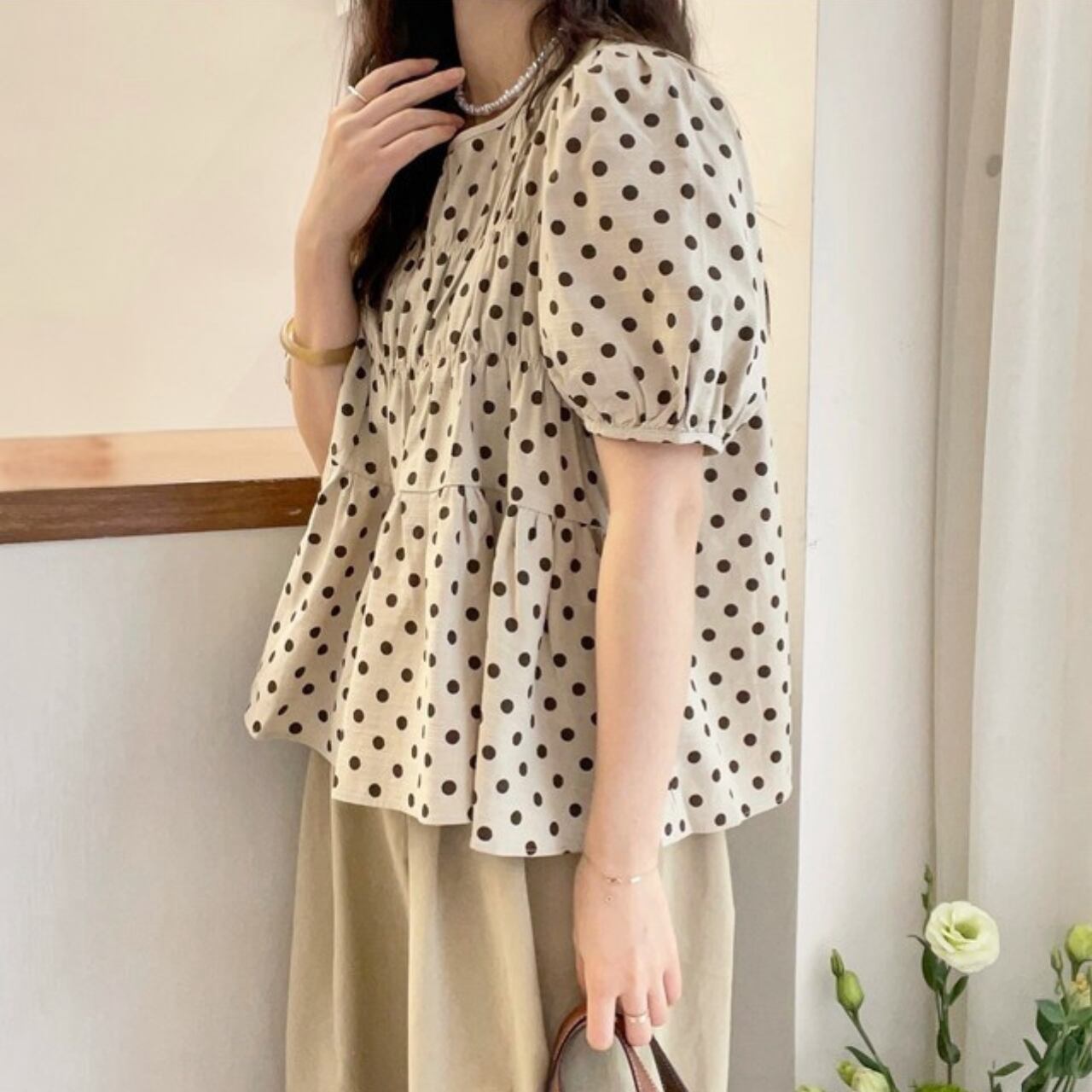 ドット柄 ギャザー パフスリーブ トップス f0119
